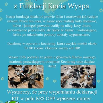 Mamy też ludzi, którzy chcą pomagać. Niektórzy finansowo, inni poprzez działanie… Stąd pomysł na założenie Fundacji. Naszą rolą jako organizacji jest koordynacja różnych form pomocy, ale także szerzenie świadomości i empatii wobec zwierząt. Środki pozyskane ze zbiórek i darowizn zamierzamy przeznaczyć na finansowanie leczenia i wyżywienia bezdomnych i wolno żyjących kotów. Konieczne jest również przeprowadzenie kosztownych sterylizacji, aby ograniczyć populację, a tym samym zjawisko bezdomności. Dla najbardziej potrzebujących kotów jedynym ratunkiem będzie znalezienie domów stałych lub tymczasowych.