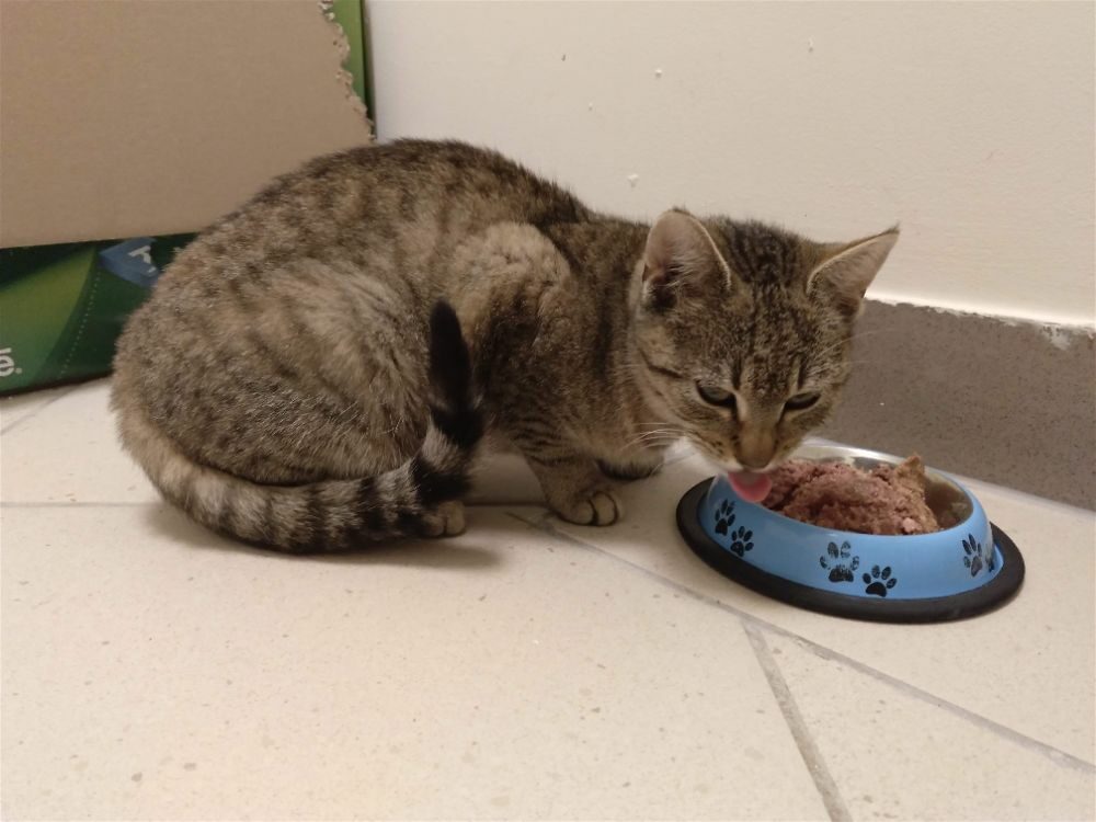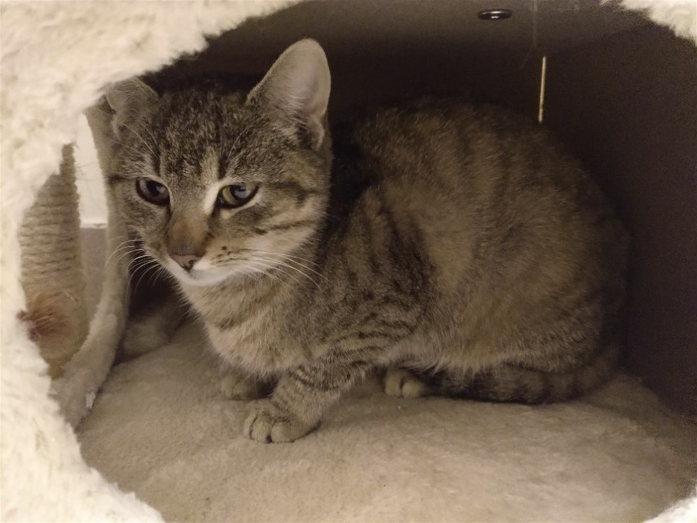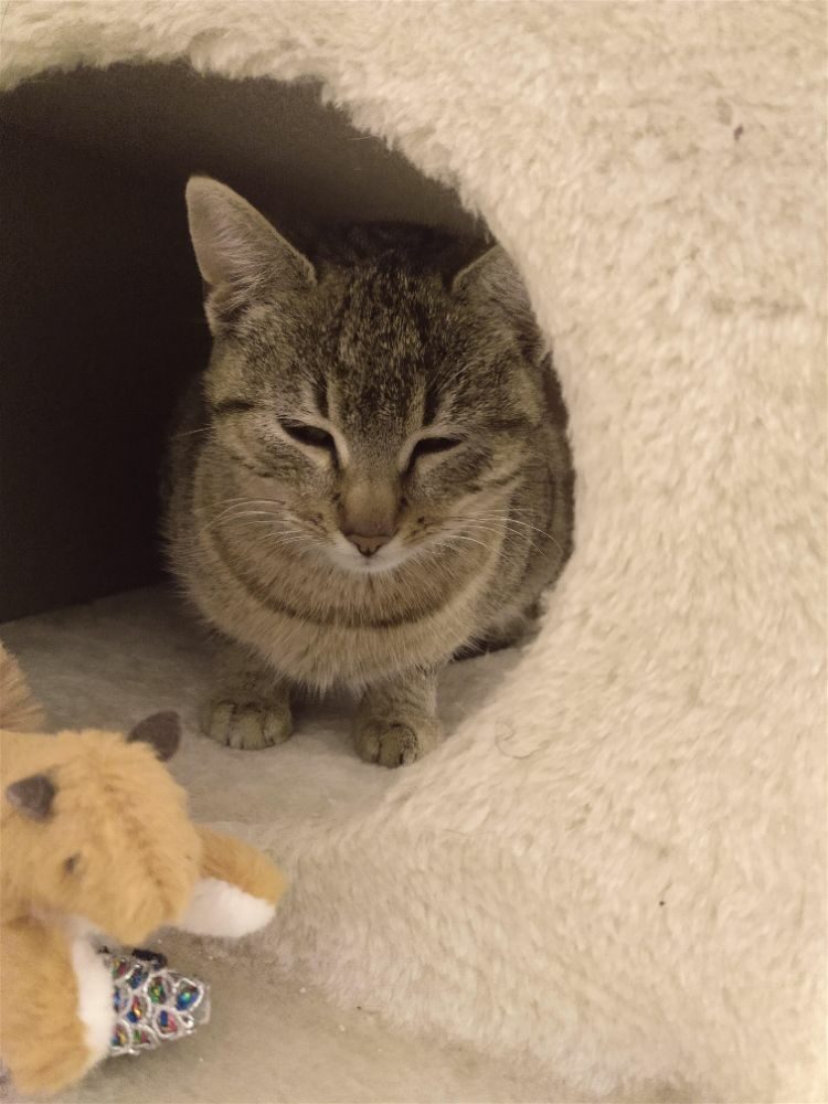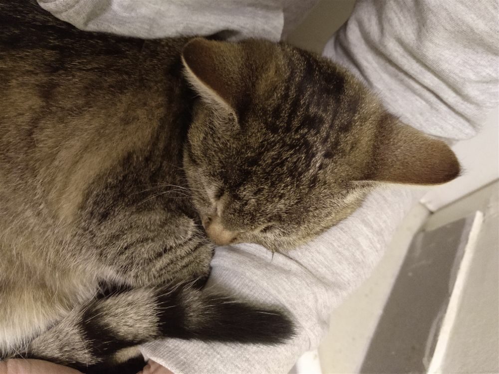 Bardzo spokojna młodziutka kotka. Uwielbia ludzi i wylegiwanie się na kolanach, mruczy i ugniata.