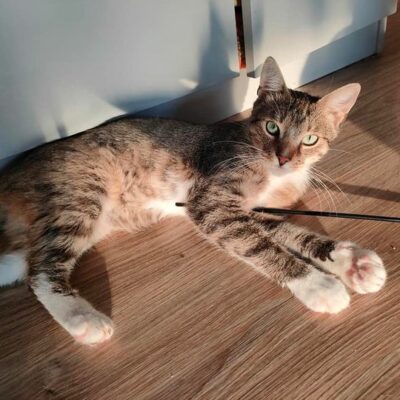 Kotka miała na tyle szczęścia, że ktoś postanowił wziąć ją pod pachę i zanieść do pani weterynarz. Tam została zaopiekowana i wykastrowana, a po szczepieniu trafiła do nas.