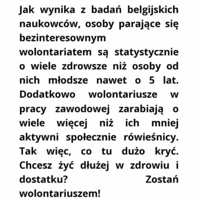 Czy wiecie, że wolontariat wydłuża życie? Przeprowadzono na ten temat wiele badań, a naukowcy zgodnie twierdzą, że prawdziwi altruiści (czyli nie dotyczy to osób angażujących się w wolontariat z pobudek egoistycznych), żyją o wiele dlużej, niż gdyby w wolontariat się nie włączali.