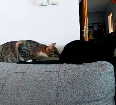Jak się okazało, między Kasjo, a ich szalonym kocim rezydentem, jest niesamowita nić porozumienia. Kocurki ganiają się i walczą na niby całymi dniami 😅 Lepiej być nie mogło 🙂