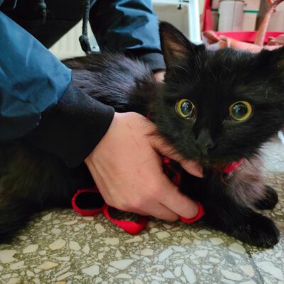 Gwiazdeczka to około 6-miesięczna, spokojna kotka, która nie do końca odnajduje się w naszej fundacji. Boi się tłumu kotów i zamieszania podczas każdego dyżuru. Ludzi bardzo kocha, lecz nie jest na tyle odważna, aby zabiegać o ich uwagę. Za to kiedy siedzimy przy niej i ją głaskamy, pięknie mruczy.