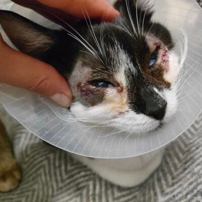 Jedna z kociaków, które zostały wyrzucone do zimnej komórki i karmione dwa razy w tygodniu, jest już po operacji oczu. Przy okazji, wykonany został zabieg sterylizacji.
