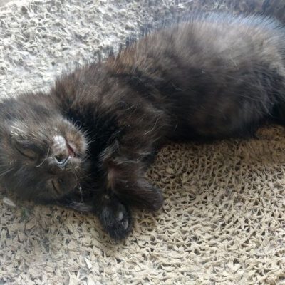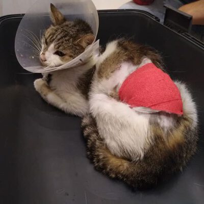 Ten kocurek został znaleziony w strasznym stanie. Uwięziony był we wnykach, a raczej w tzw. „oczku”, które stanowi drut, zaciskający się na ofierze w wyniku ruchu. Ten drut przeciął go niemalże na pół, a biedak chodził z nim zapewne wiele tygodni. Trafił do lecznicy w środku nocy i od razu przystąpiono do operacji usuwania kawałka metalowej żyłki. Oprócz tego, w jego ciele znaleziono śrut.