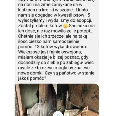 Dostaliśmy taką wiadomość. Pilnie potrzebne domy tymczasowe. Narazie trafiły do nas dwa kotki z tego miejsca, lecz ze względu na trudną sytuację nie możemy obecnie zabrać wszystkich.