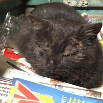 Dostaliśmy jednak zgłoszenie o tym kotku po wypadku, który umierał w samotności w jednym z wiejskich budynków gospodarczych. Nie mogliśmy odmówić 🙁