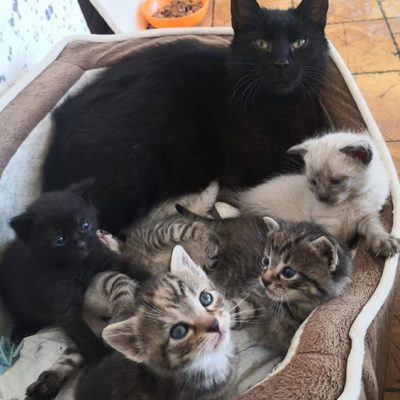 Kocia rodzinka zamieszkała w klatce w jednym z przepełnionych domów tymczasowych. Czy ktoś chciałby zapewnić że im ciepłe domowe schronienie i opiekę na najbliższych kilka tygodni? Zapewnimy jedzonko, żwirek i opiekę weterynaryjną.