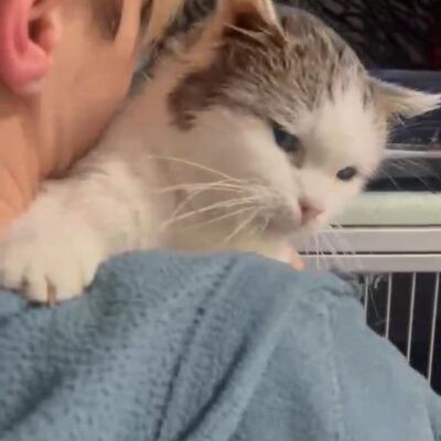 Był obolały a jedna łapka była w nienaturalnej pozycji. Dodatkowo maluch był bardzo brudny i wychudzony – czuć mu każdą kosteczkę 🙁