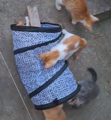 Kociaki były przemoknięte i głodne. Ktoś porzucił je zapewne wczoraj lub jeszcze wcześniej. Mają jeszcze niebieskie oczka, a ich wiek oceniony został na ok. 5 tygodni.