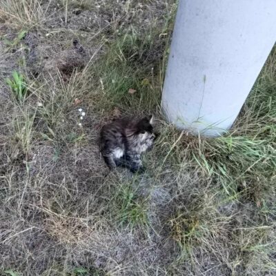 Wieczorem otrzymaliśmy informację o kociątku leżącym w upale przy słupie oświetleniowym na terenie jednej z wsi pod Stalową Wolą. Według relacji zgłaszającej, maluch miał problemy z chodzeniem, a wokół latały muchy 🙁 W pobliżu, nie było domów mieszkalnych, a jedynie cmentarz i pola, więc pewnie został tam wyrzucony. Kociątko było bardzo słabe, a przy ogonku widać było głęboką ranę.