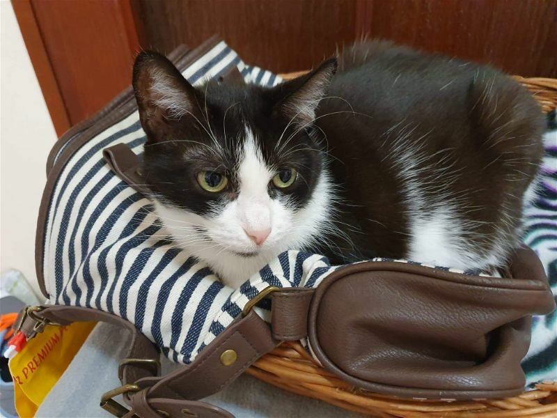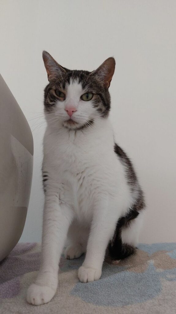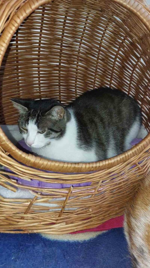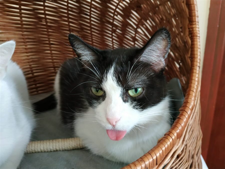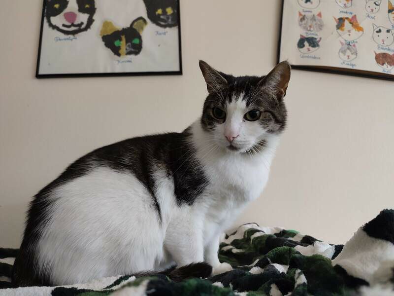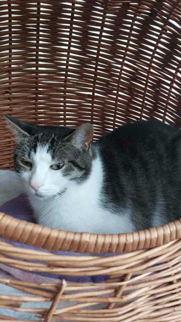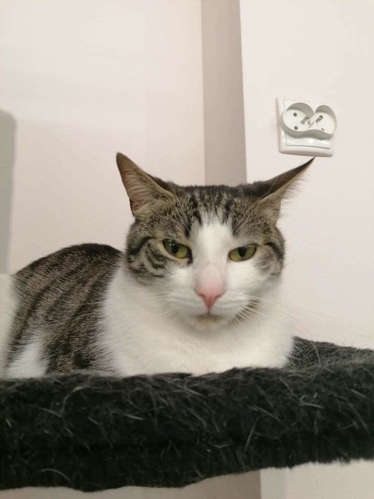 Córeczka trafiła do nas z interwencji, która odbyła się w Nowej Dębie, na samym początku działania naszej fundacji. Jest kotką, która jako kociak przeszła zapalenie opon mózgowych. Do dziś ma zaburzenia neurologiczne, a jej zachowanie wymaga dużo zrozumienia. Chętnie jednak podchodzi do człowieka, szuka kontaktu i opowiada historie 😉