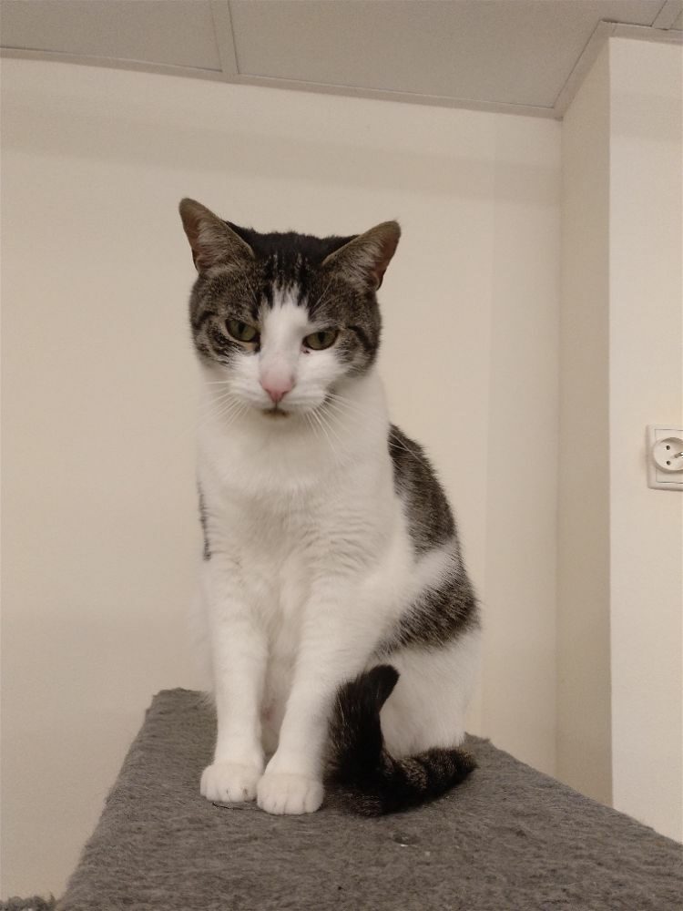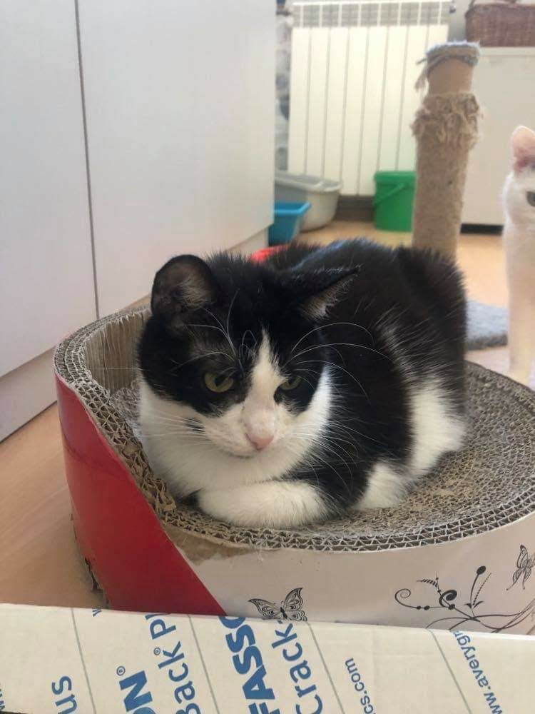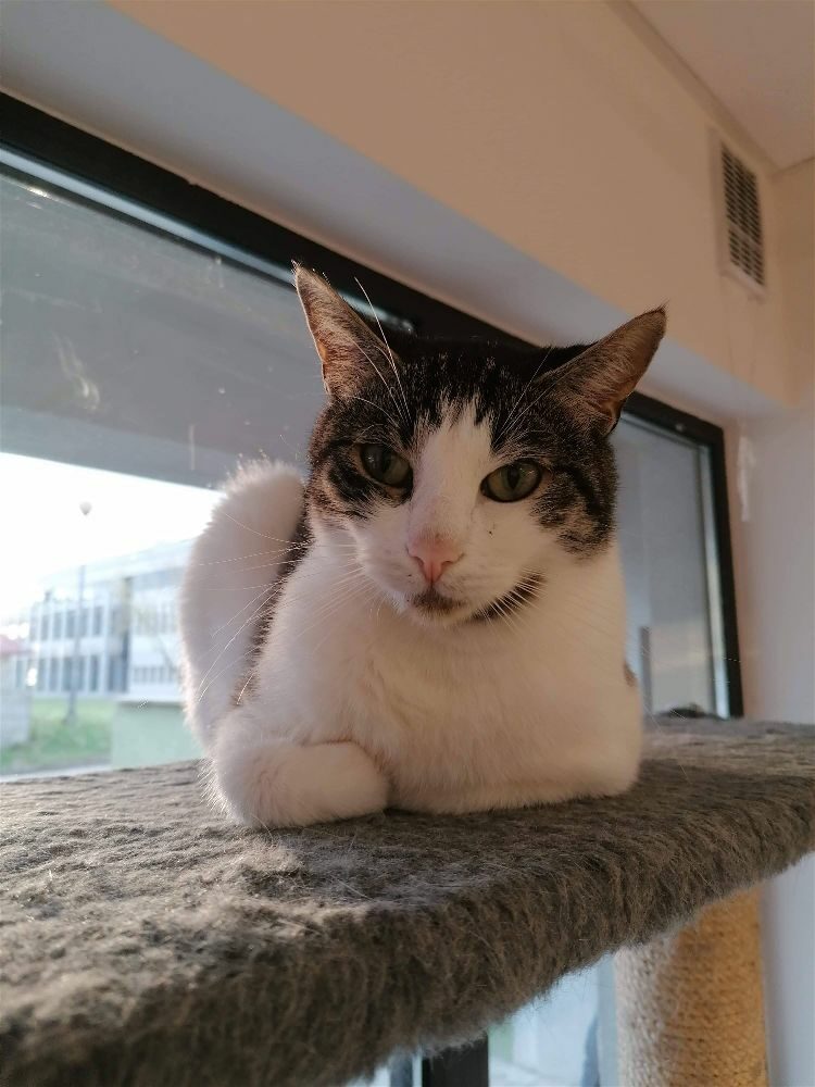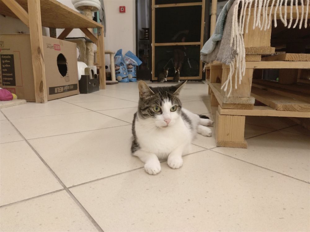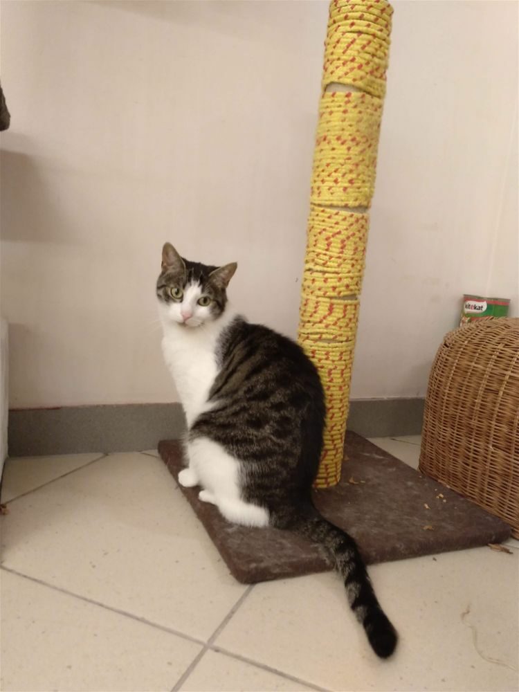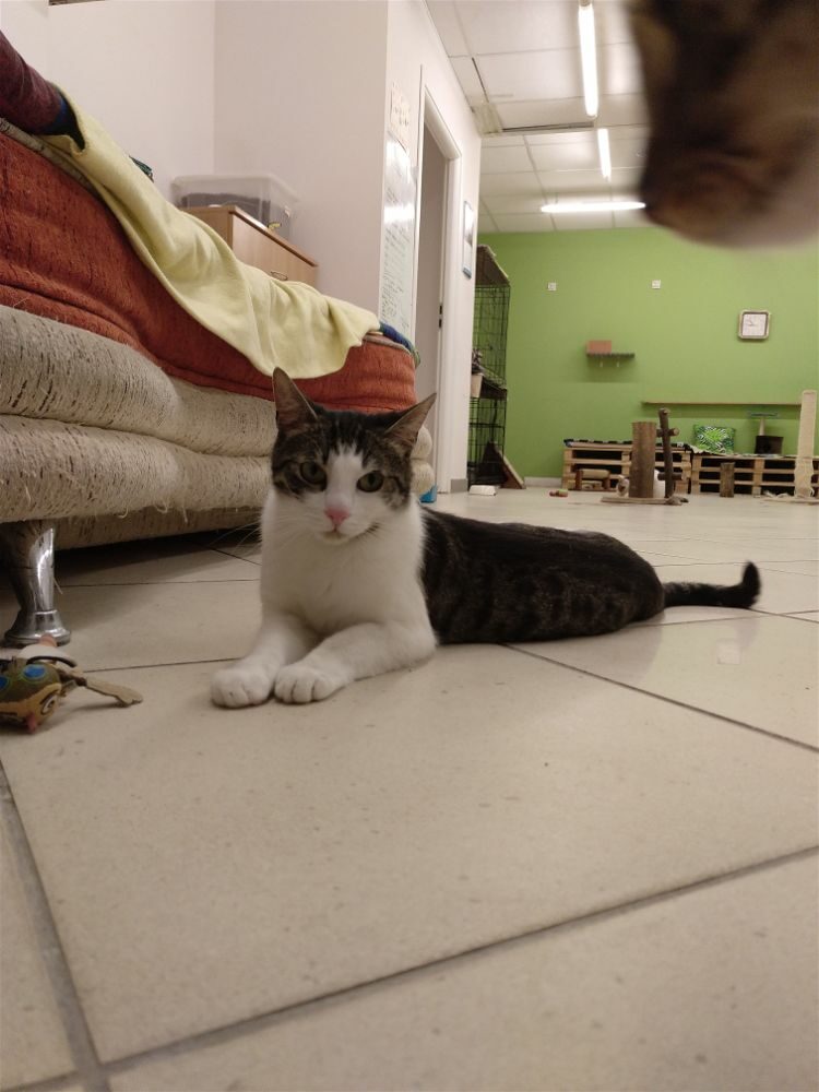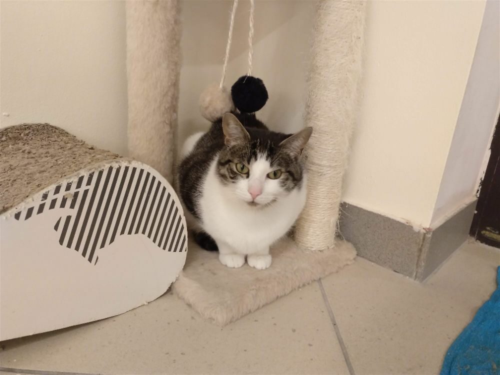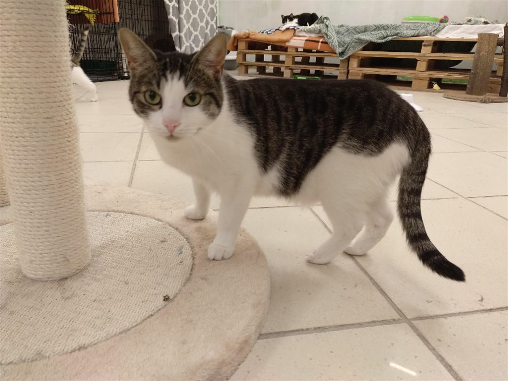 Kotka bardzo pragnie kontaktu z człowiekiem, lecz troszkę się jeszcze boi. Idealna do spokojnego domu, bez zwierząt i dzieci. Do adopcji pójdzie razem ze swoją ulubioną zabawką – niebieskim tunelem, przy którym spędza bardzo dużo czasu każdego dnia.