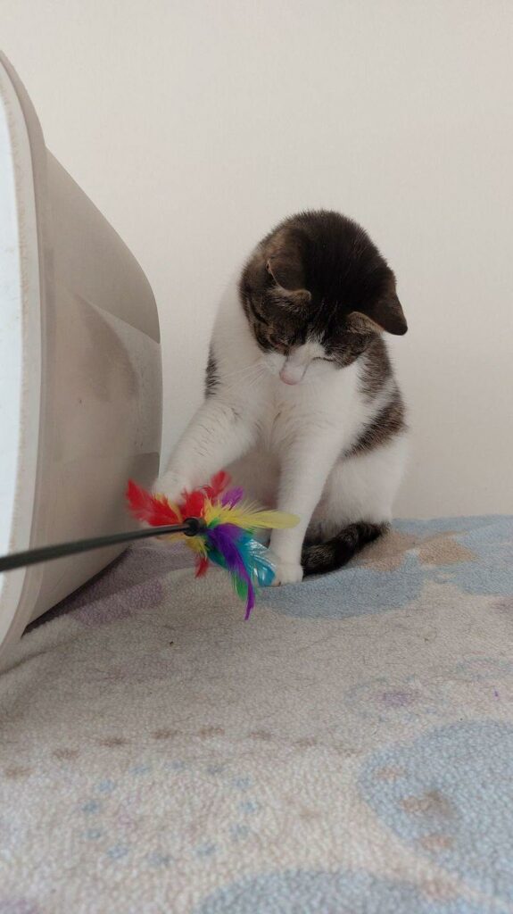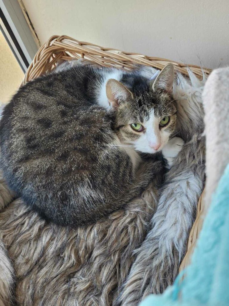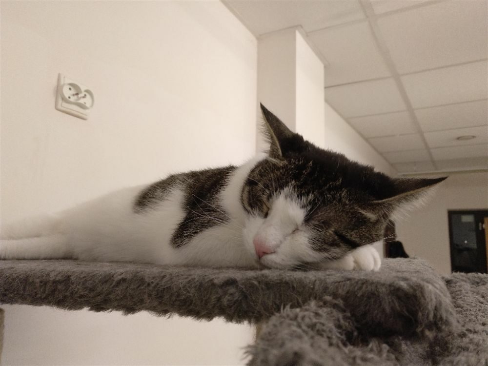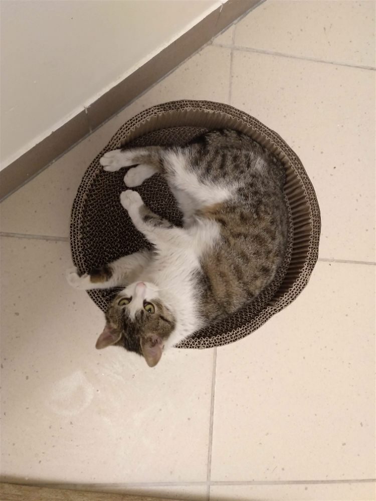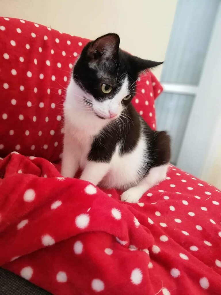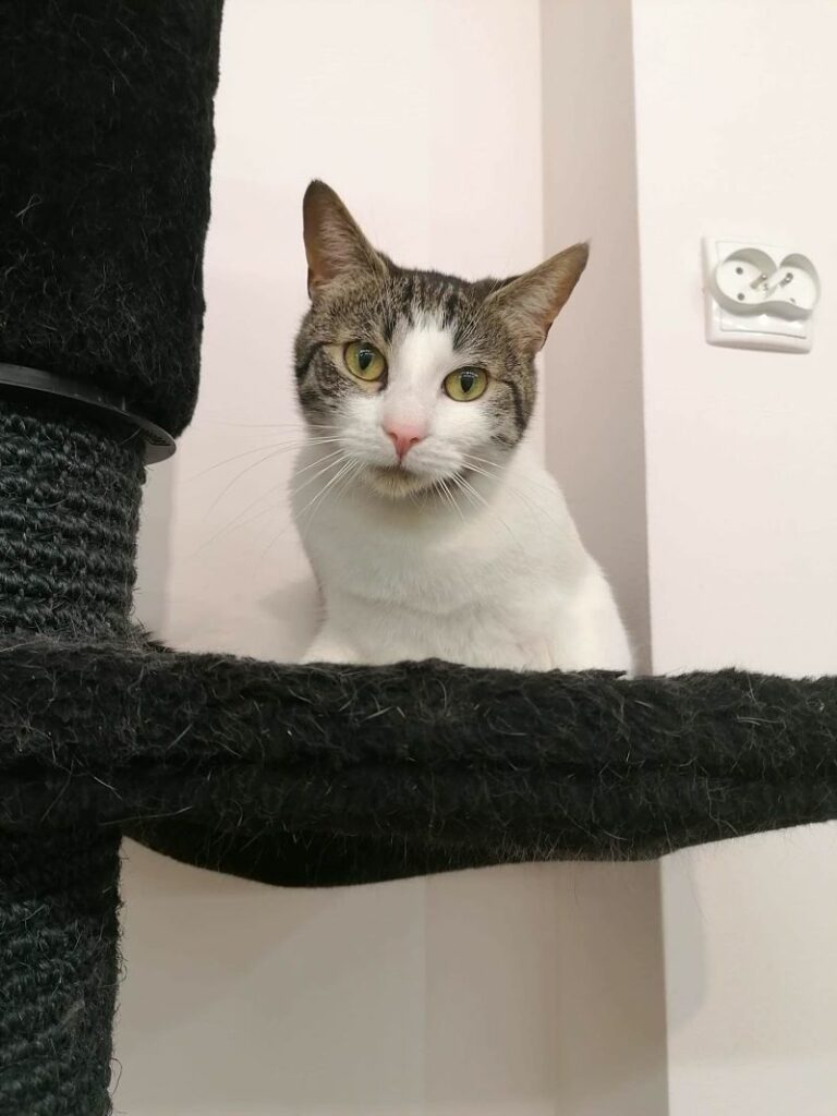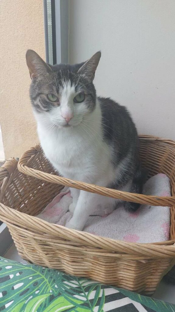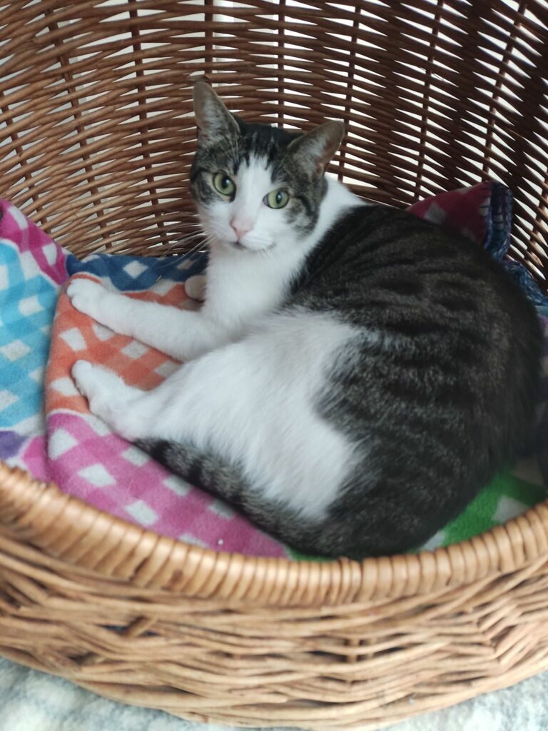 Przyjęliśmy ją do siebie i od pierwszego dnia się zakochaliśmy <3 Kotka, która sprawiała wrażenie dzikawej, jest przemiła – kocha ludzi, wykłada się do głaskania i ugniata radośnie łapkami. Została już przebadana na wirusy i zaszczepiona.