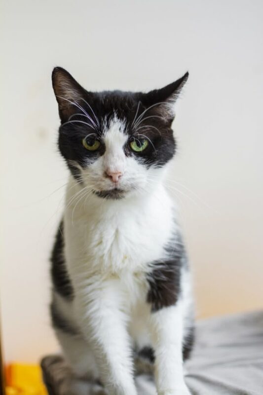 Córeczka trafiła do nas z interwencji, która odbyła się w Nowej Dębie, na samym początku działania naszej fundacji. Jest kotką, która jako kociak przeszła zapalenie opon mózgowych. Do dziś ma zaburzenia neurologiczne, a jej zachowanie wymaga dużo zrozumienia. Chętnie jednak podchodzi do człowieka, szuka kontaktu i opowiada historie 😉