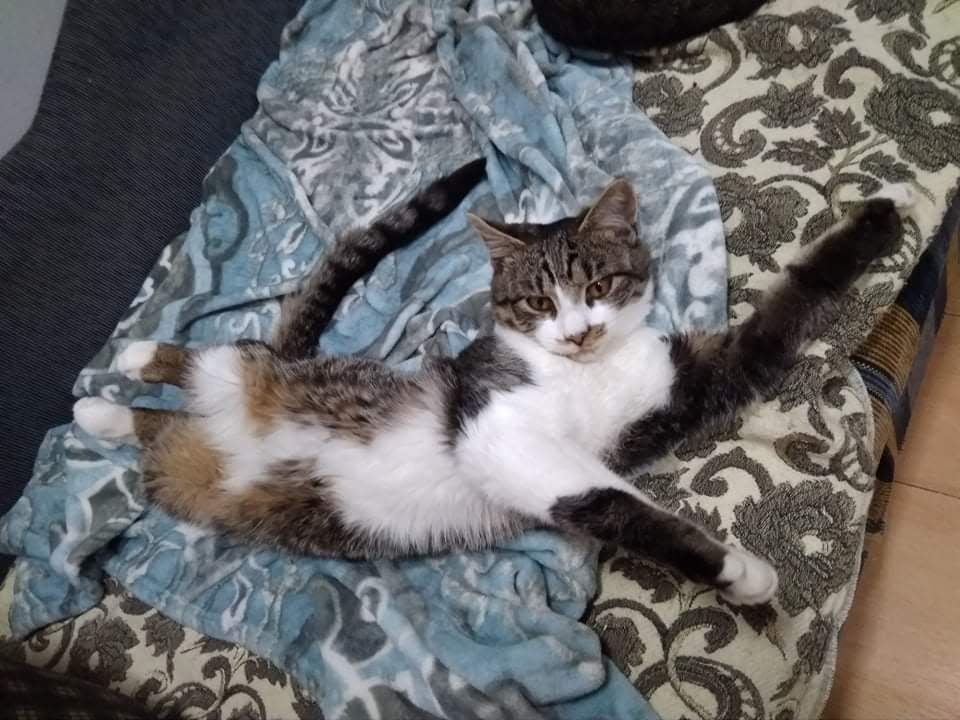 Wciąż pokazuje wdzięczność za pomoc i pełną miskę mrucząc i ocierając się o każdego. Jest cudowną kotką, która łaknie miłości do człowieka.