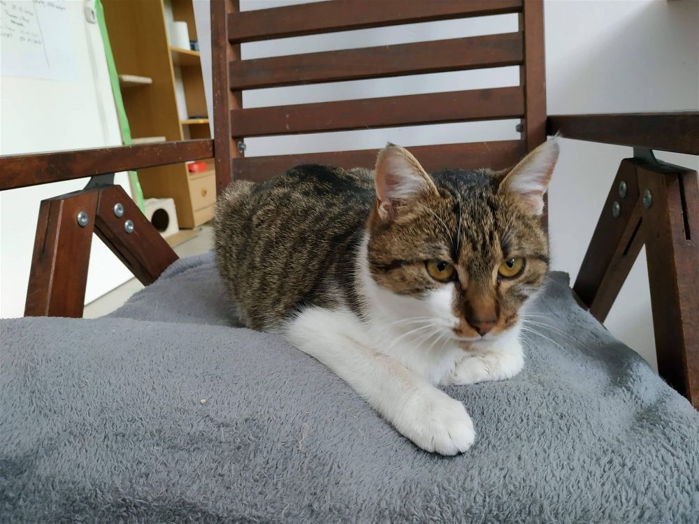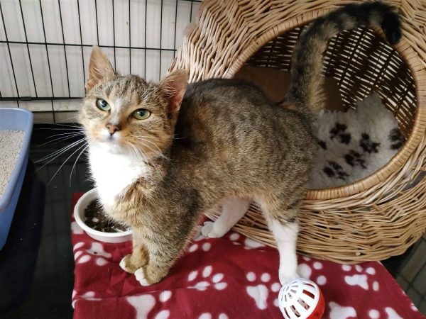 Kotka została znaleziona na czyjejś posesji wraz z trójką rodzeństwa, prawdopodobnie przyszły od kotki sąsiadów pozostawione samopas. Uwielbia głaskanie. mruczy, ugniata, przychodzi do człowieka po więcej, czasem jest bojaźliwa. Uwielbia ganiać za piłeczkami. Do oddania z kocim towarzystwem.