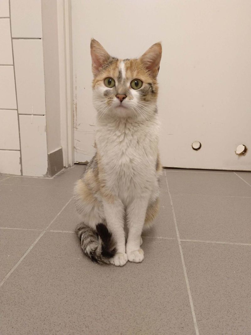 Ta piękna i wyjątkowo przyjazna kotka, pojawiła się w miejscu, gdzie nasza wolontariuszka trzyma pieczę nad wolno żyjącym stadem dzikusków. Kotka w wieku około 1,5 roku, z pewnością od dłuższego czasu się błąkała.