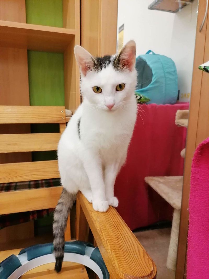 Kotek błąkał się od kilku dni chodząc za człowiekiem i wołając o uwagę. Jest bardzo miła, troszkę bojaźliwa, ale tuli się do każdego.