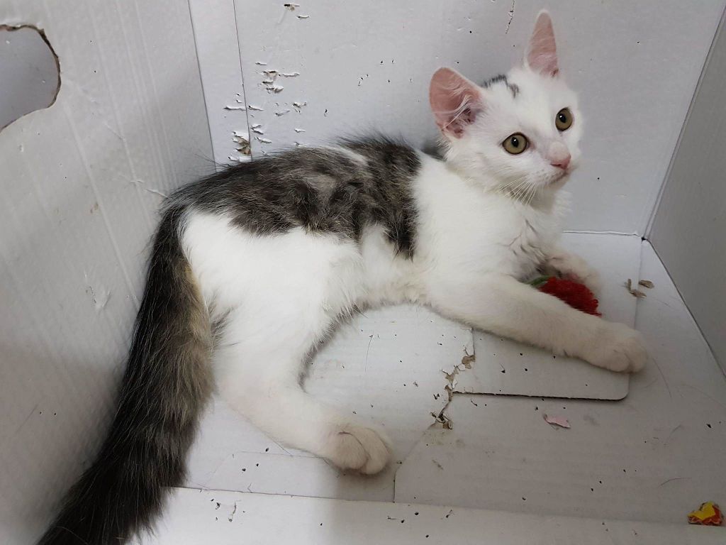 Kociak trafił do nas z rodzeństwem, błąkali się po garażach szukając schronienia. Margerita uwielbia się bawić i być głaskana.