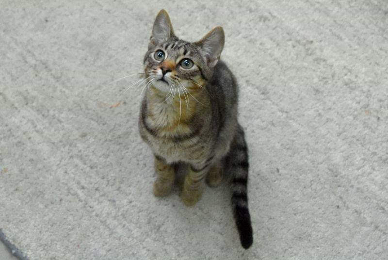 Kotek trafił do nas jako mały kociak wraz z siostrą. Jest bardzo nieśmiały, ale uwielbia się bawić i, w przeciwieństwie do siostry, być głaskany.
