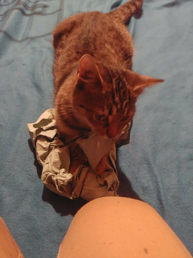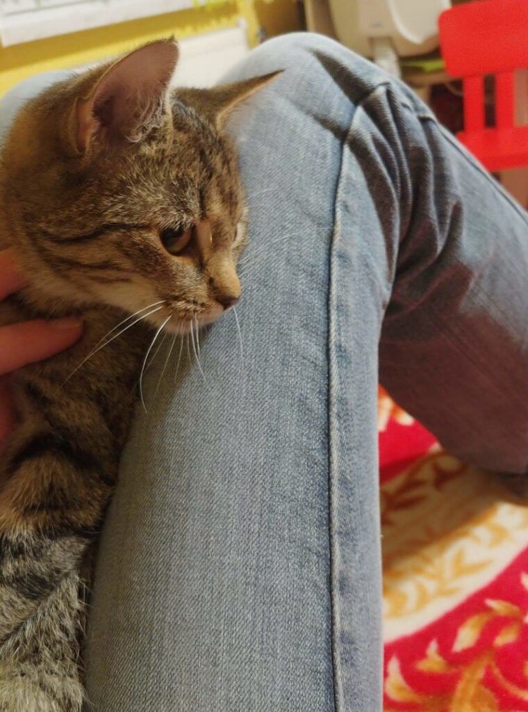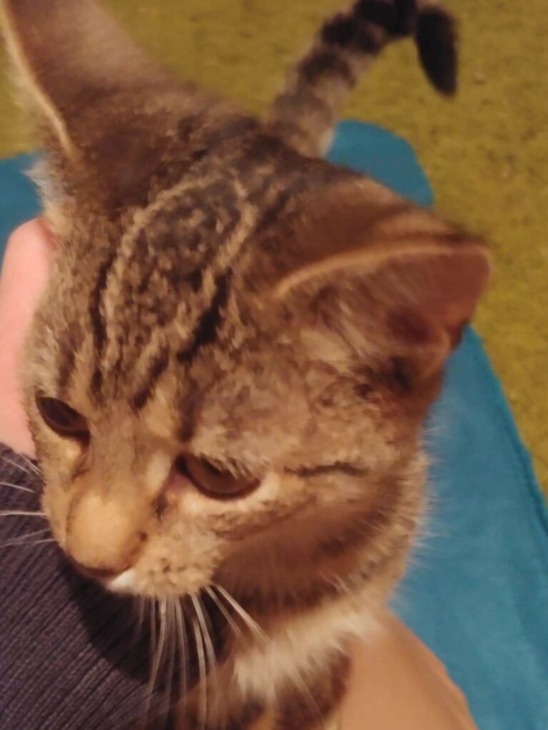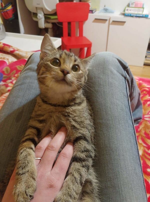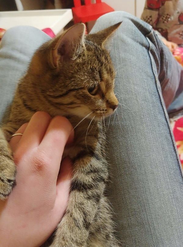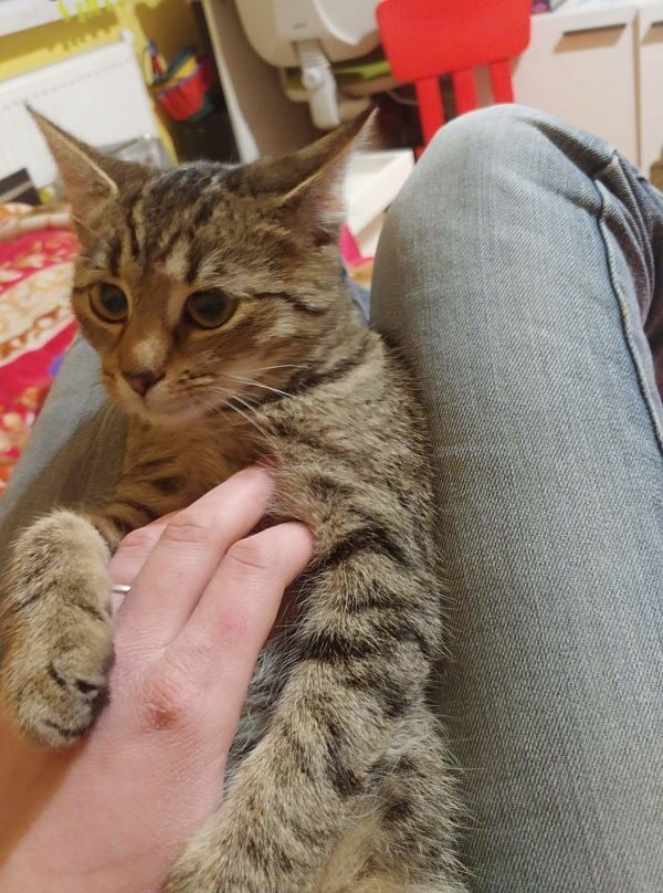 Kotka kocha ludzi, dosłownie wchodzi na głowę i domaga się miłości. Uwielbia siedzieć na ramieniu. W przeszłości została przez dzieci poturbowana tak, że wymagała leczenia. Teraz kocha dzieci, koty i psy. Obecnie zdrowa i gotowa do pokochania.
