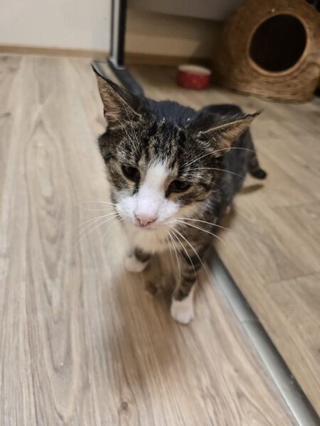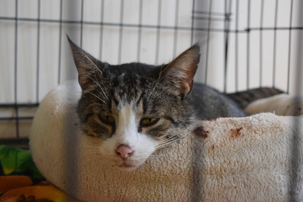 Pimpuś to starszy, schorowany kotek, przyjęty przez nas ze schroniska. Przez długi czas był tam leczony. Trafił do nas z dużym bólem, uporczywym, mokrym kaszlem, a wkrótce po przyjęciu zaczęły się biegunki.