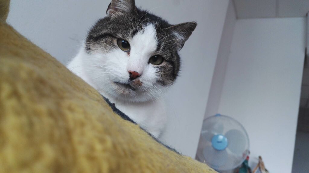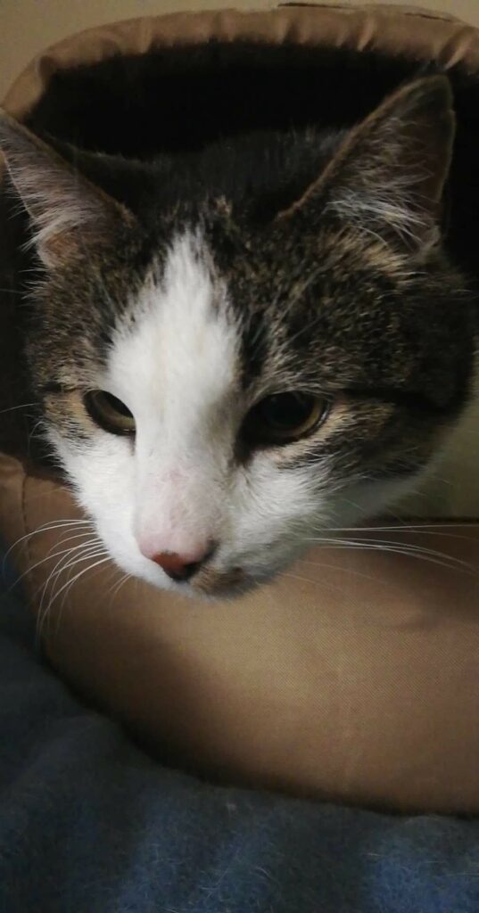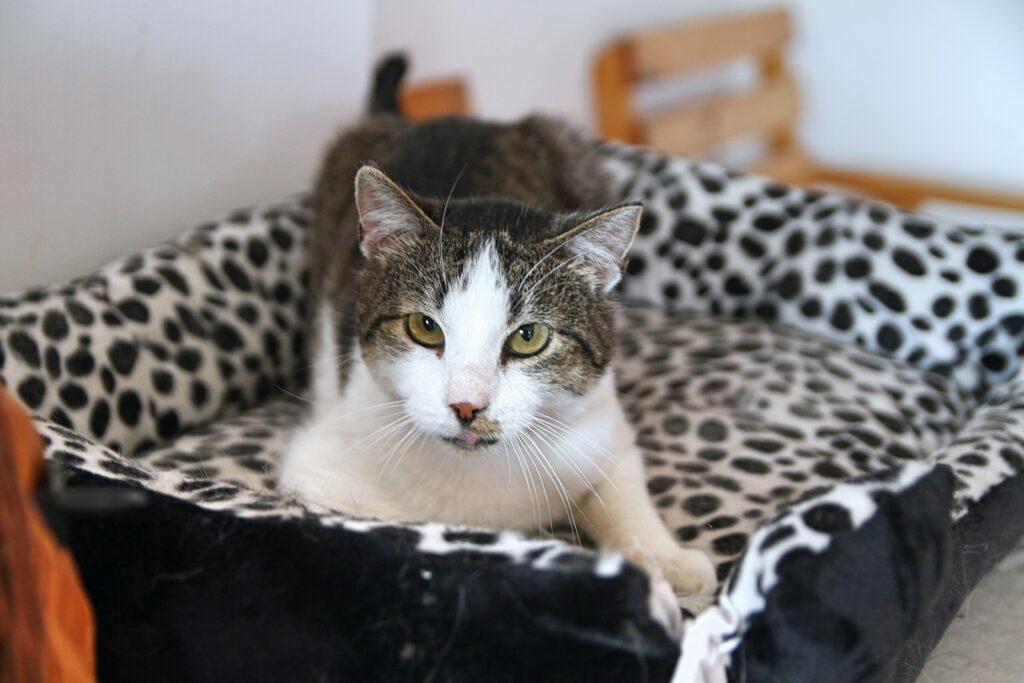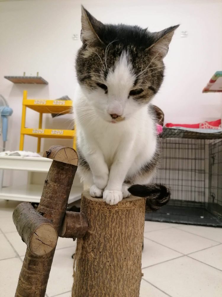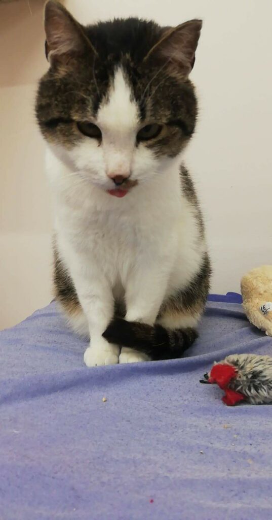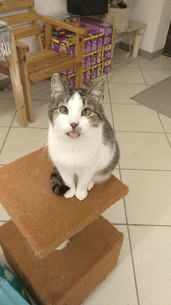 Kotka jest nosicielką kociej białaczki, lecz wirus jest i niej bezobjawowy… dziewczynka jest zdrowa i radosna, a kiedy tylko zjawiamy się w fundacji, biegnie się przywitać.