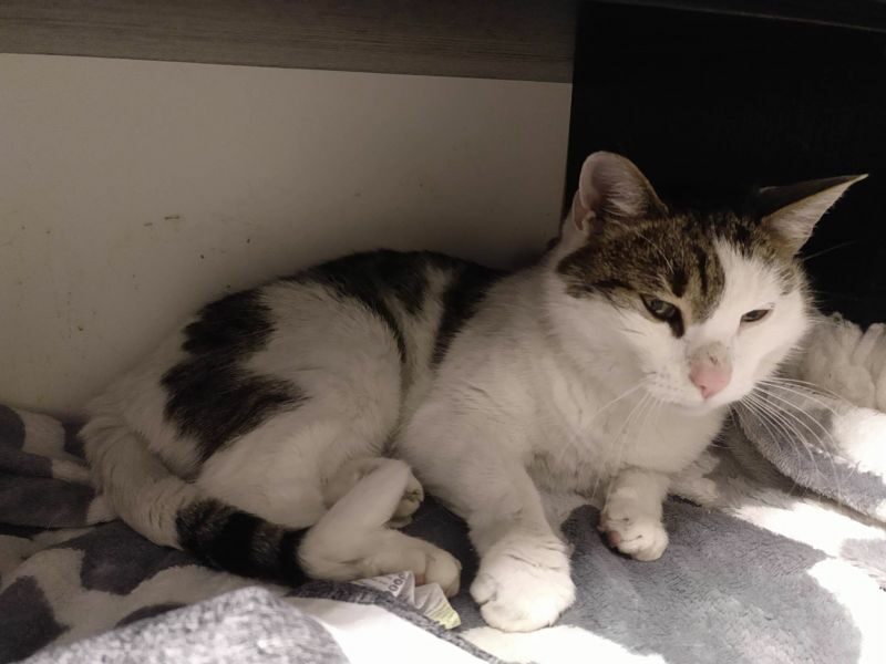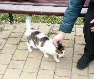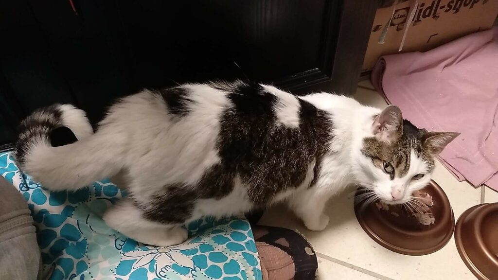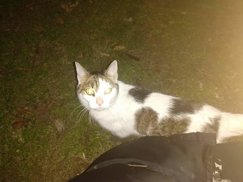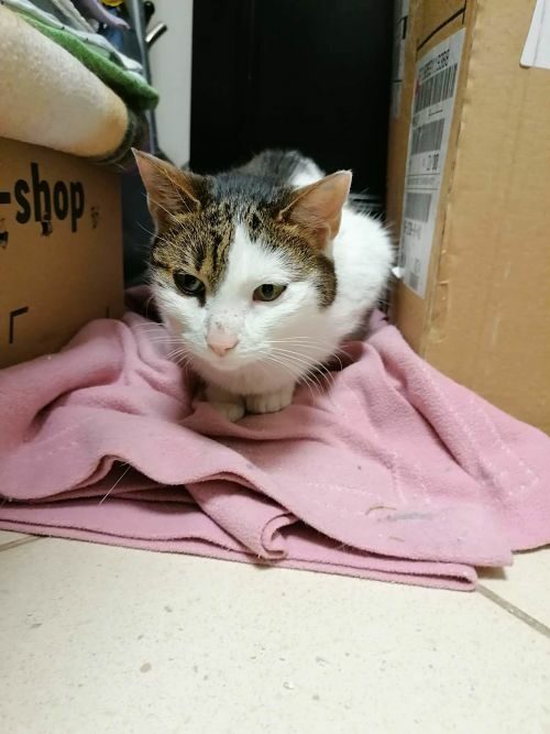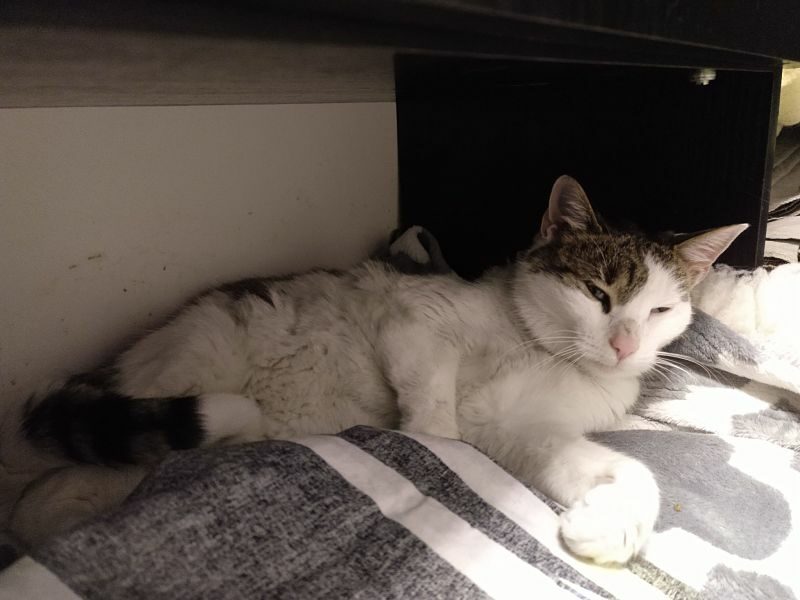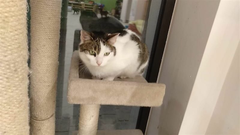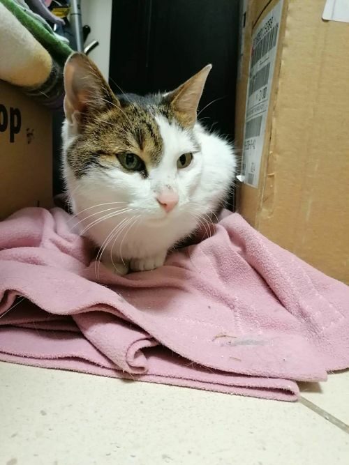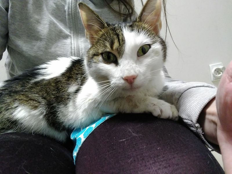 Ta piękna i wyjątkowo przyjazna kotka, pojawiła się w miejscu, gdzie nasza wolontariuszka trzyma pieczę nad wolno żyjącym stadem dzikusków. Kotka w wieku około 1,5 roku, z pewnością od dłuższego czasu się błąkała.