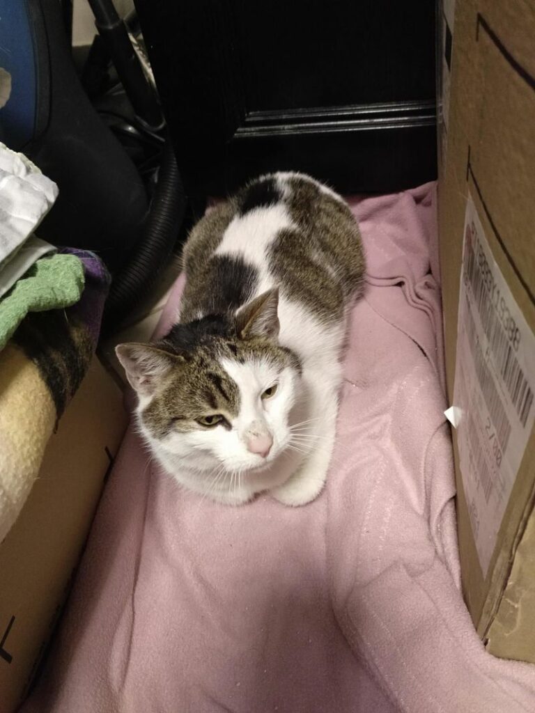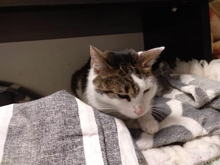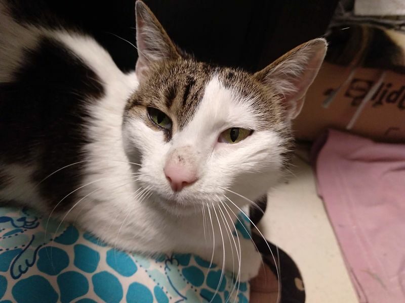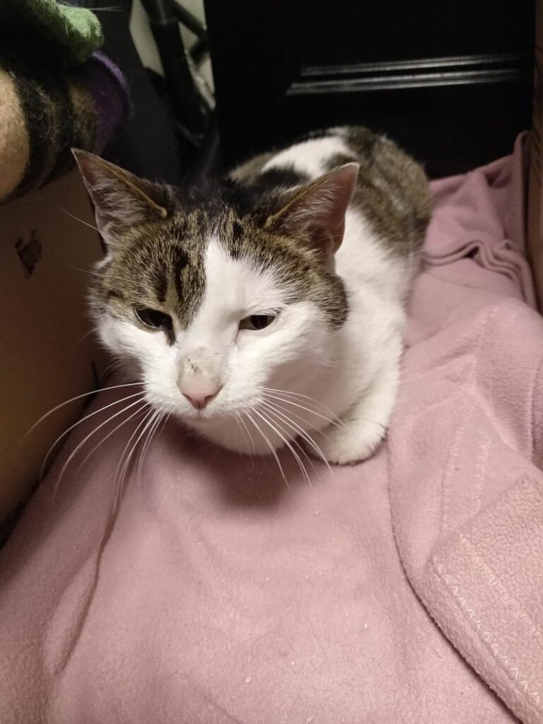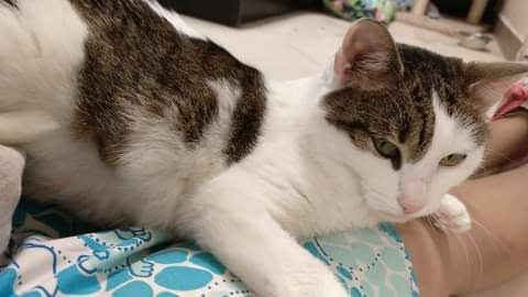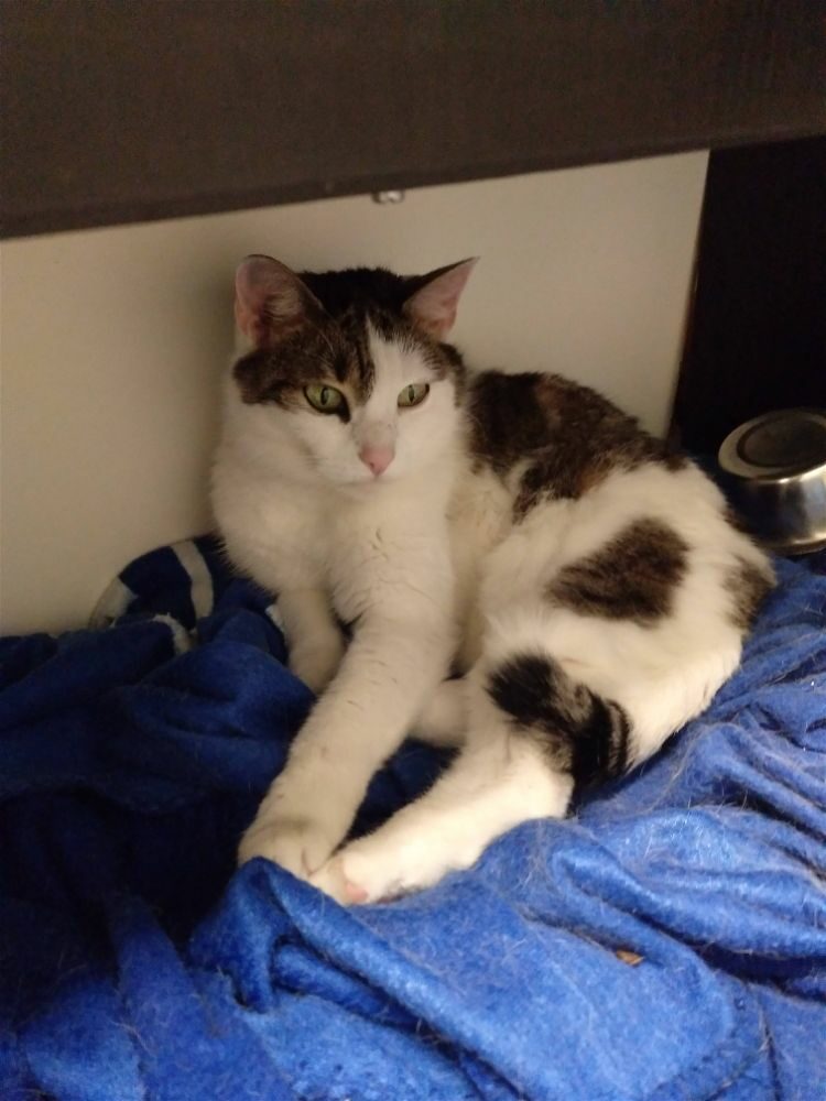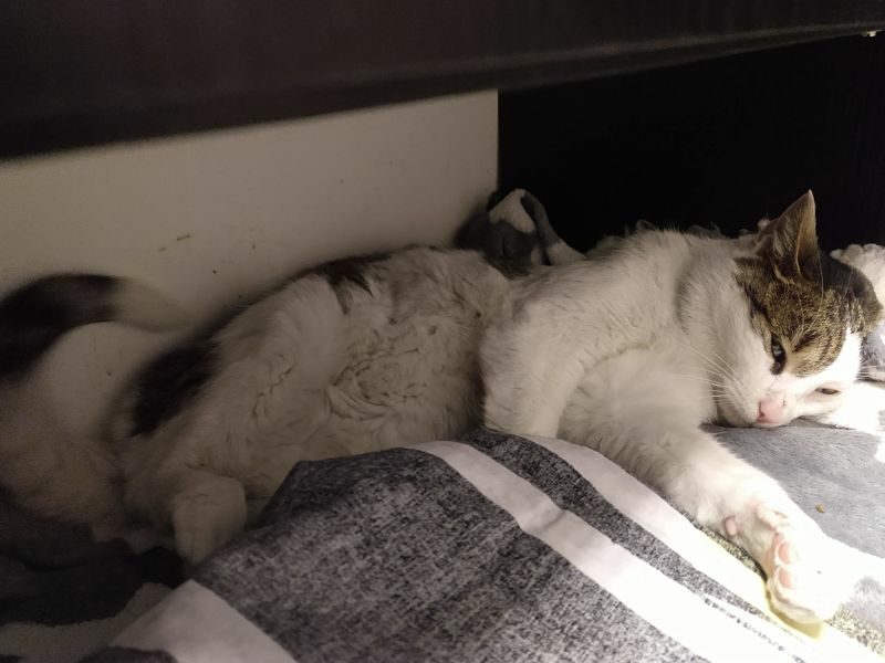 Ta piękna i wyjątkowo przyjazna kotka, pojawiła się w miejscu, gdzie nasza wolontariuszka trzyma pieczę nad wolno żyjącym stadem dzikusków. Kotka w wieku około 1,5 roku, z pewnością od dłuższego czasu się błąkała.