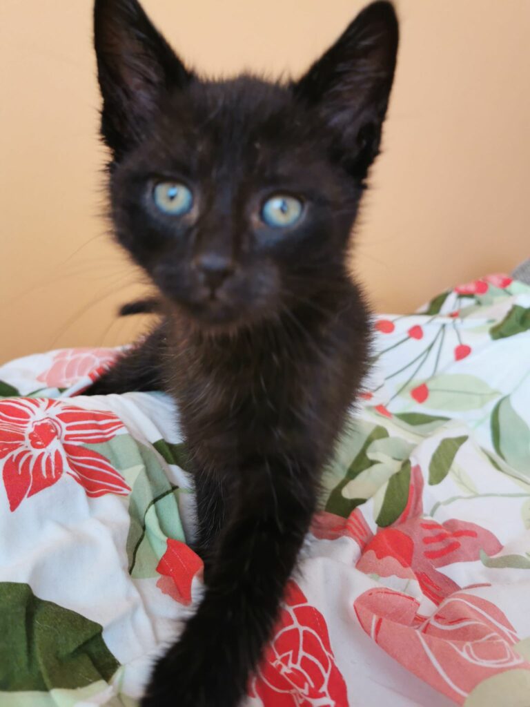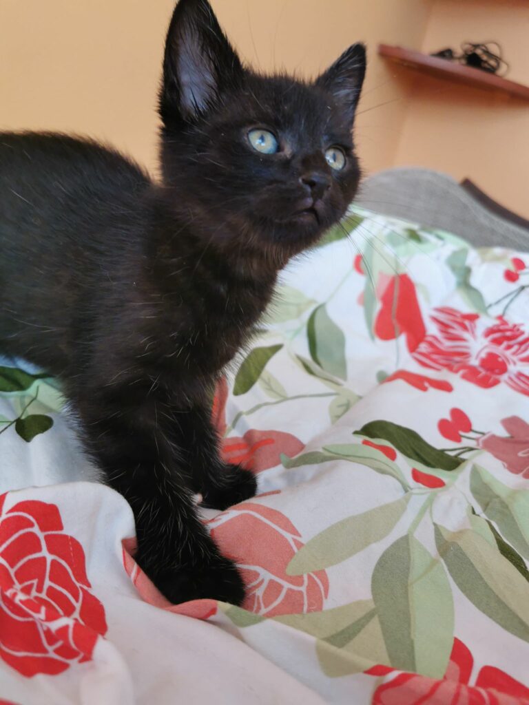 Murzynek to mały kotek, znaleziony jako 3 tygodniowe kociątko bez matki, wykarmiony butelką przez dwoje wspaniałych ludzi, trafił do wolontariuszki na tymczas. Murzynek jest rezolutnym kociakiem, wszędzie go pełno, jest ciekawski lubiący zabawy. Ciężko mu usiedzieć w miejscu. Je za dwóch, nie jest to na pewno kotek nakolankowy. Lubi zarówno człowieka jak i koty. Jest zaszczepiony, odrobaczony.