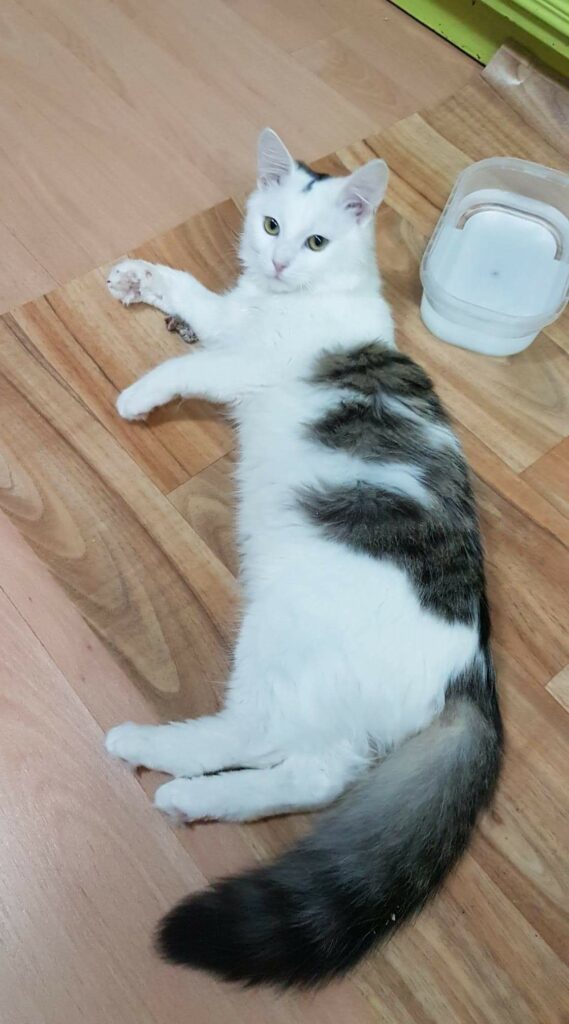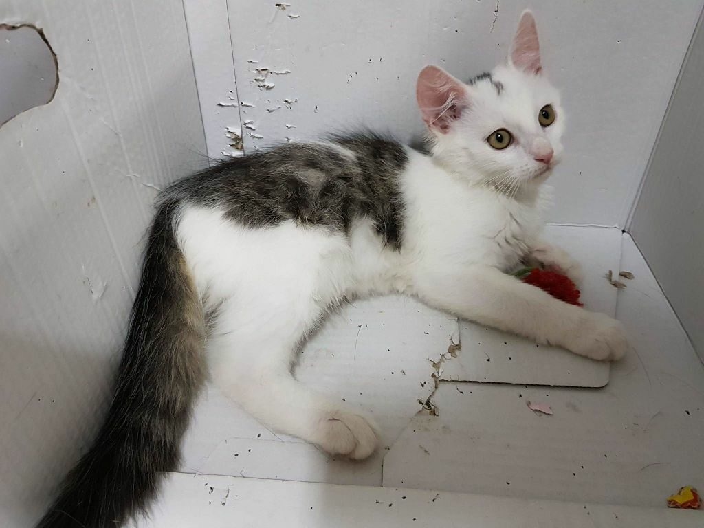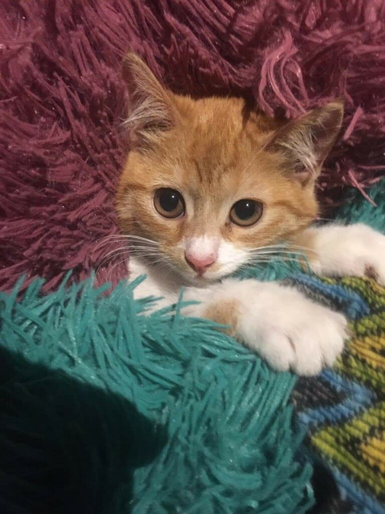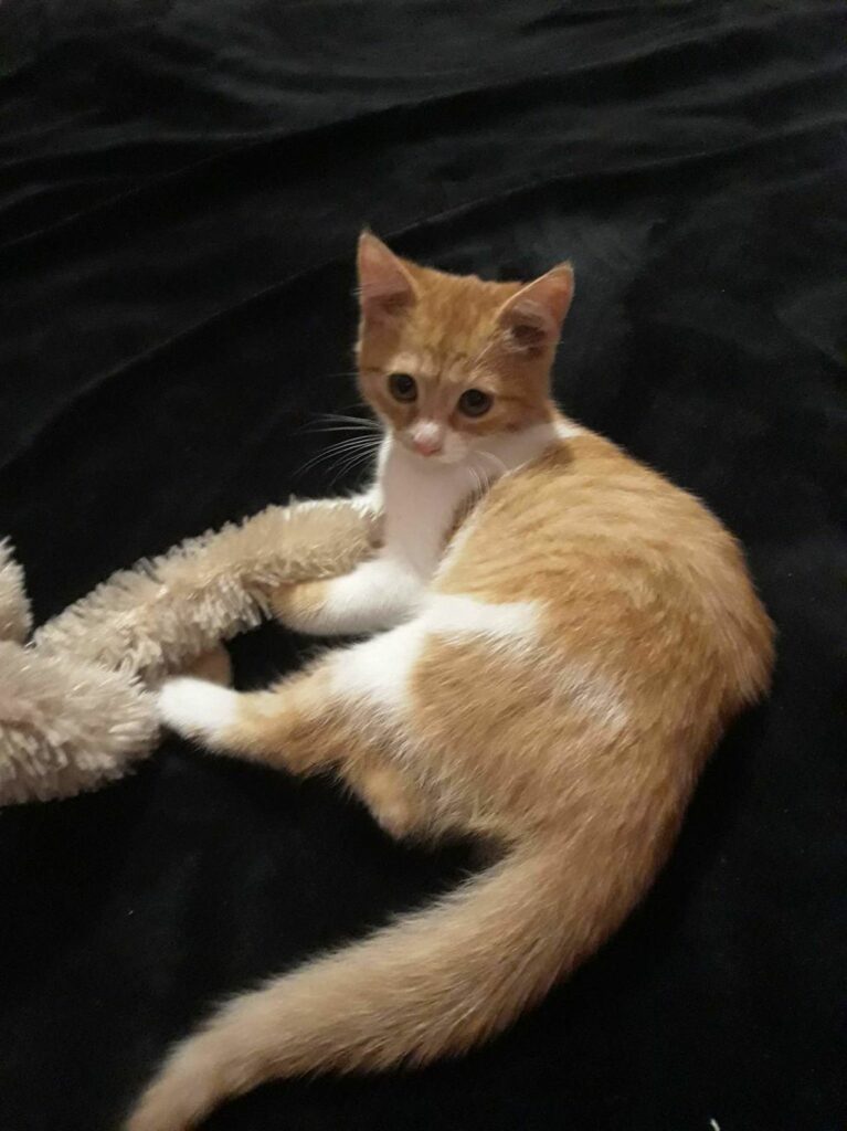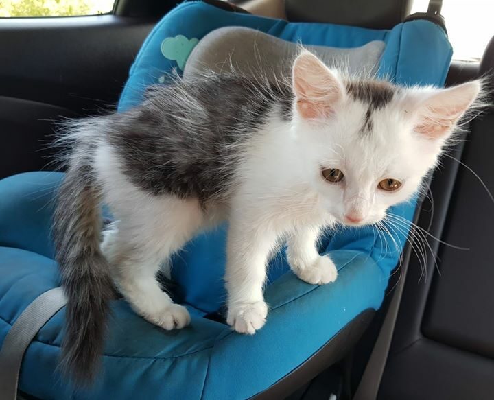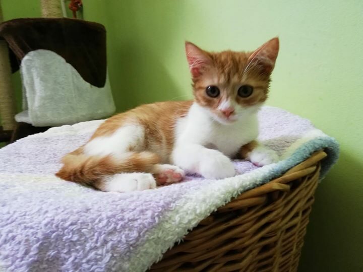 Ten oto kocurek znalazł się sam w środku lasu i bardzo głośno nawoływał mamę. Miał szczęście, że został zauważony przez rowerzystów, którzy go zabezpieczyli. Kocurek był wychudzony i miał biegunkę, ale już wrócił do sił po leczeniu w domu tymczasowym. Został zaszczepiony.