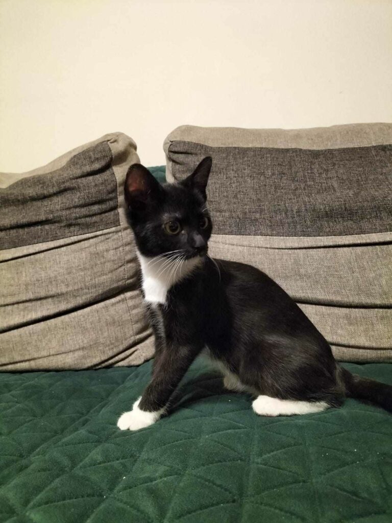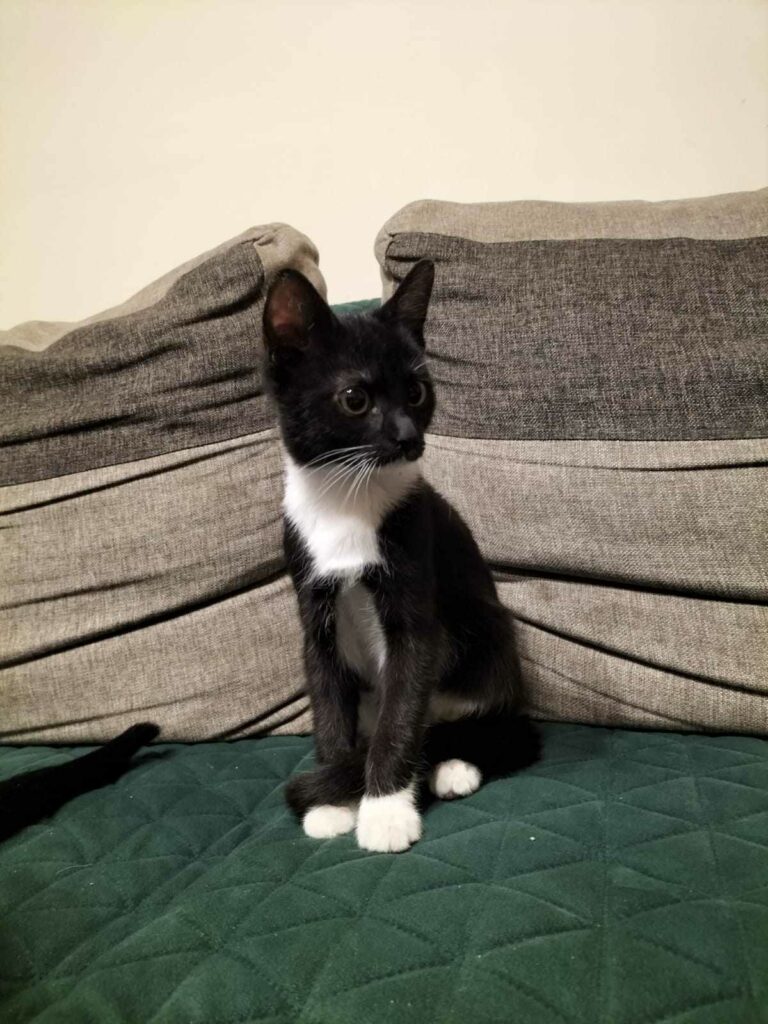Kocurek odebrany interwencyjnie przez policję, od ludzi nadużywających alkoholu. Nie spodziewaliśmy się że to będzie taki wyjątkowy kot! Wystarczy do niego podejść a on sam wdrapuje się niczym na Mount Everest na sam szczyt człowieka, po czym zaczyna głośno mruczeć, lizać i czasami niechcący nawet ugryźć w ucho z tej całej ekscytacji. Gandhi jest dosyć potężnym kotem z krzywymi łapkami, co jednak nie wprawia go w żadne kompleksy.