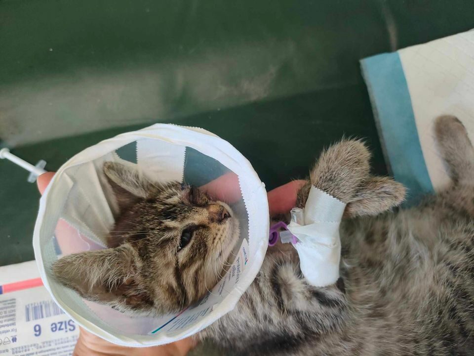 To co ujrzeliśmy na miejscu przerosło nasze najgorsze koszmary. Koci maluch został przywieziony w papierowej torbie – słaby i przerażony. Rana ogromna, jak po pogryzieniu – pełna larw, zjadających maluszka żywcem. Widok był straszny 🙁
