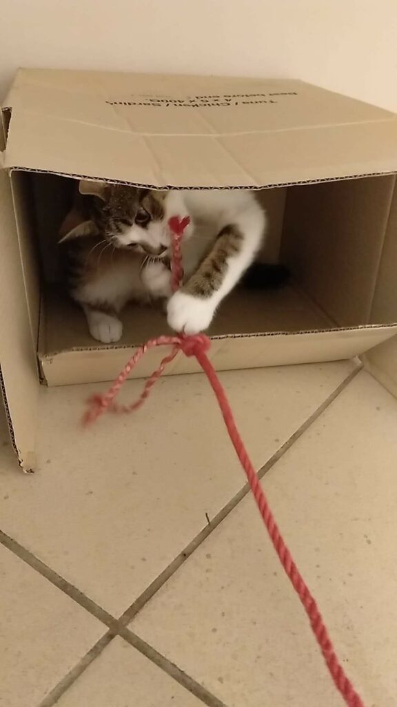 Jaka jestem? Jestem ogólnie grzeczna, zajmuję się sobą, ale kocham biegać za piłeczką i ganiać za piórkami. Uwielbiam się przytulać! Troszkę się boję na początku nowych ludzi.
