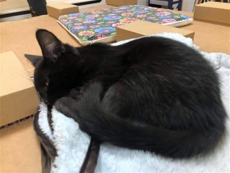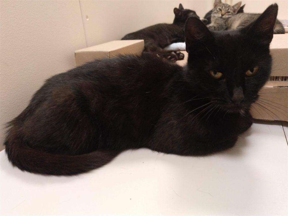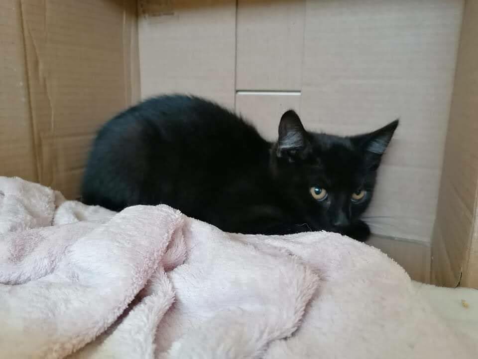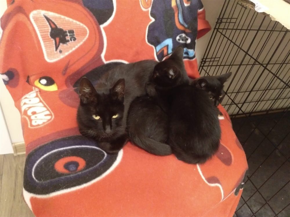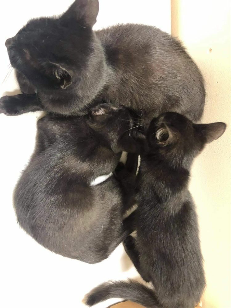 Kiedy tylko zwolniła się izolatka, odebraliśmy mamusię z trzema maluszkami. Już wcześniej zadbaliśmy o szczepienia całej rodzinki, aby nie zaraziły się u nas kocimi wirusami. Czarna kocia mama jest cudowna i delikatna, nieśmiała ale ufna.