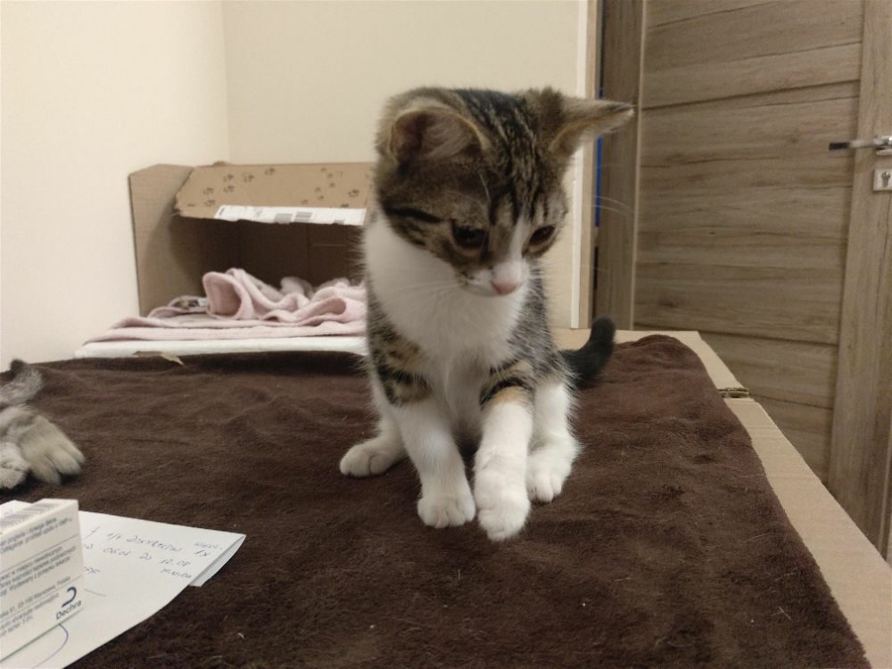 Z maluchami codziennie jesteśmy w lecznicy. Dorosłe kotki cierpią na infekcje oczu, uszu, a jedna z nich niepokoi nas ze względu na przyspieszony oddech i dziwne bólowe odruchy. Łącznie mamy z tamtego miejsca trzy kotki i pięć kociąt. Leczenie daje już pierwsze efekty.