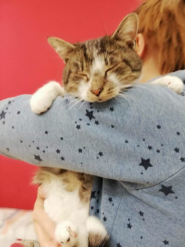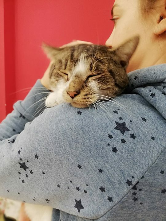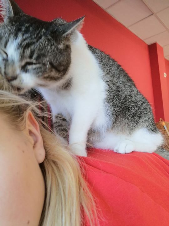 Charlie okazał się kotem w każdym calu wspaniałym. Jest łagodny, przyjacielski, potrafi wskakiwać na ramiona i układać jęzorem piękne fryzury (prawda jest taka, że nasze wolontariuszki przychodzą do fundacji czesać się przed imprezami, a kot zyskał przydomek mafijny „Fryzjer”).