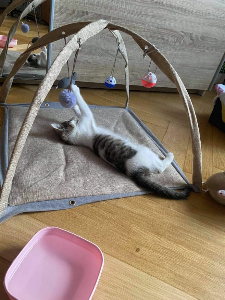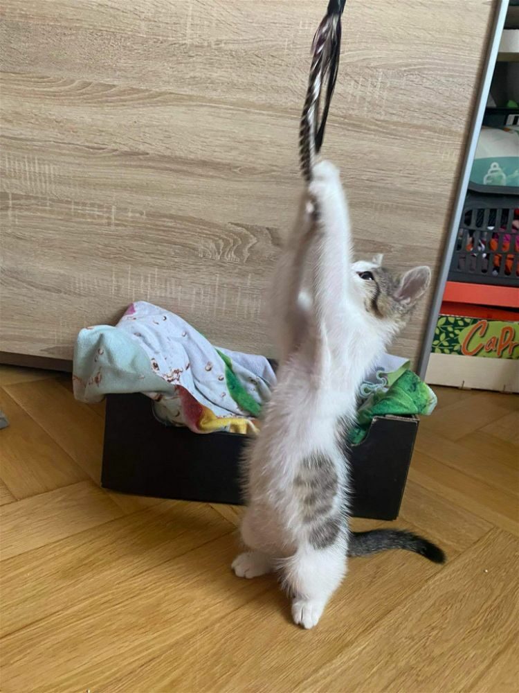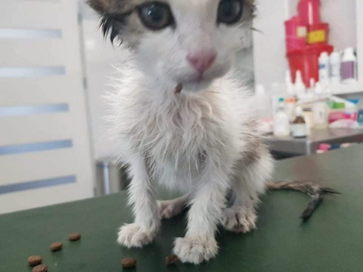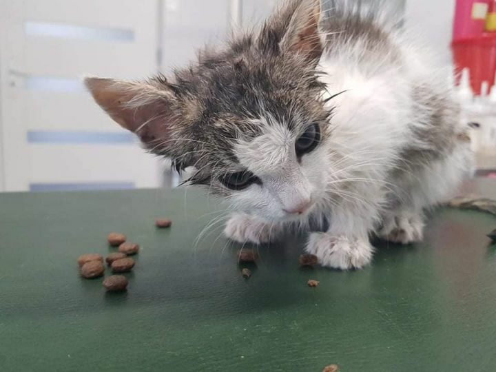 Koteczka jest w strasznym stanie – przeraźliwie chuda, z anemią. Po leczeniu i dobrym karmieniu, powinna odzyskać siły. Ta kruszynka otrzymała preparaty na pchły, odrobaczenie, antybiotyk oraz surowicę. Czekają ją dwa szczepienia.