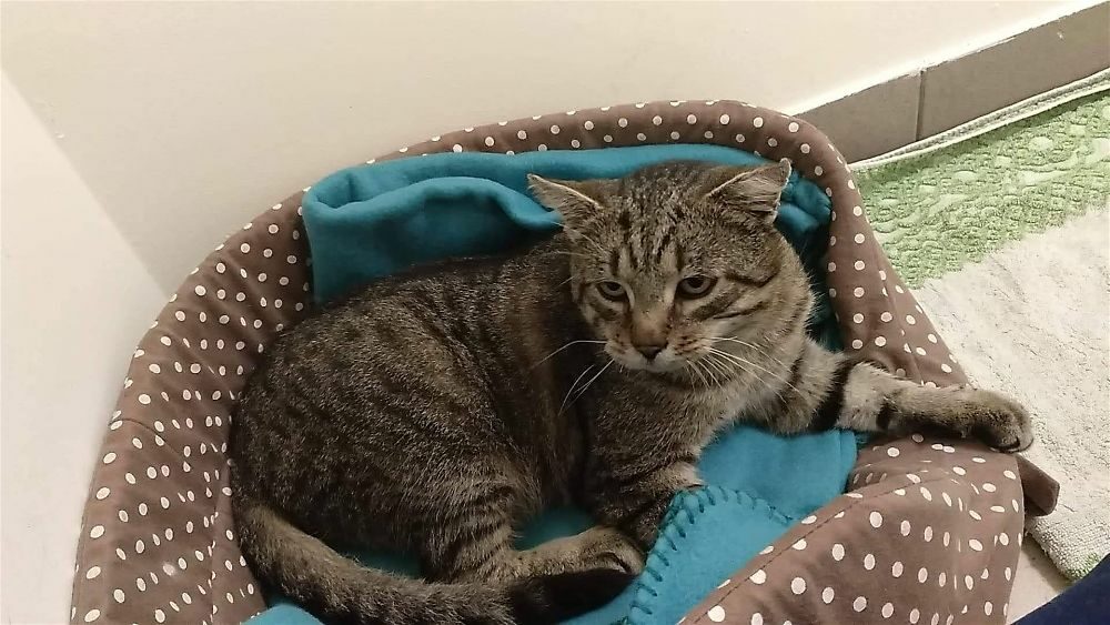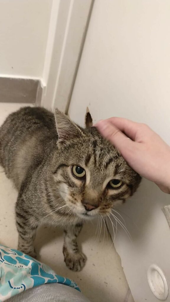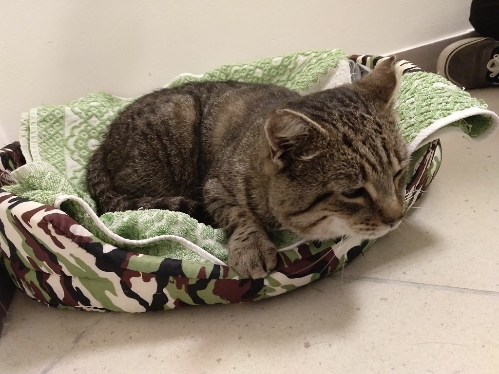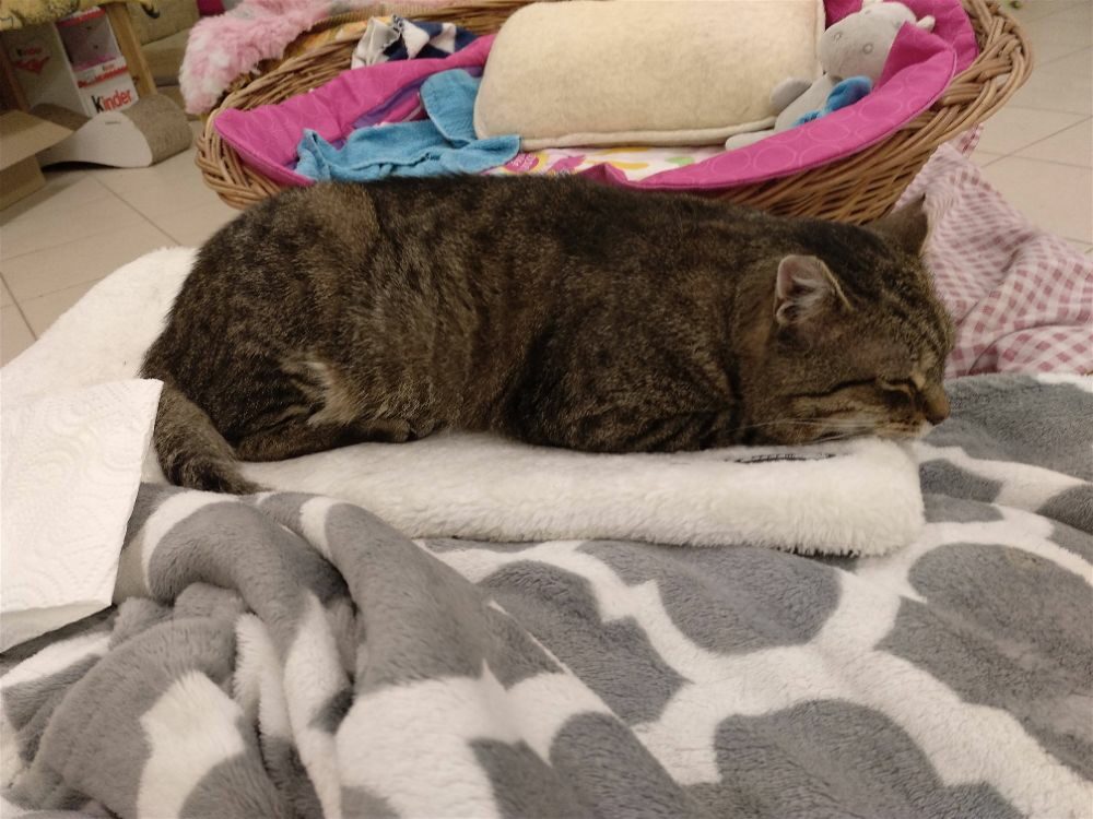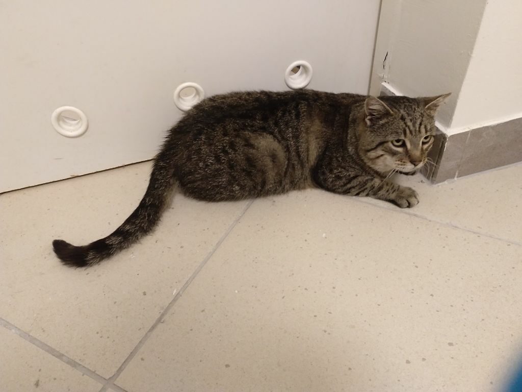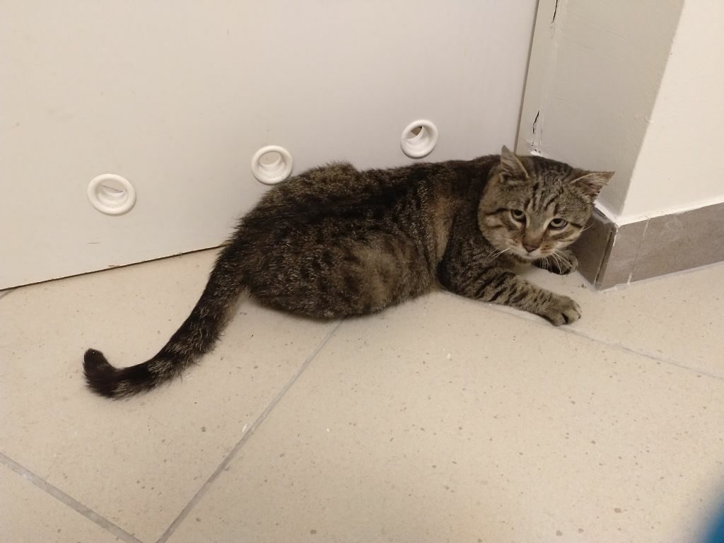 O Fredku dostalyśmy cynk od sąsiadki, na miejscu już na nas czekał, spał przytulony do ściany bloku. Obudziłyśmy go. Miejscowa mówiła, że on tam jest już latami, ale ludzie go raczej nie lubią, kopią go, a on to wogóle ma chyba padaczkę. Jak ma atak to spada ze schodów, wpada w miski itp… Jedna pani o niego trochę dbała, zrobiła mu legowisko, dawała jeść i jakaś budkę wywalczyła od schroniska, ale Fredka inne koty przeganiały. Ludzie mu zostawiali lekko otwarte drzwi do klatki, żeby się ogrzał – to ktoś WYKRĘCIŁ stopke z drzwi. Kiedyś dzieci go nosiły, a on dostał atak, spadł i się bardzo poobilał. Wtedy dostal antybiotyk..