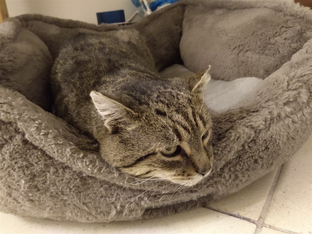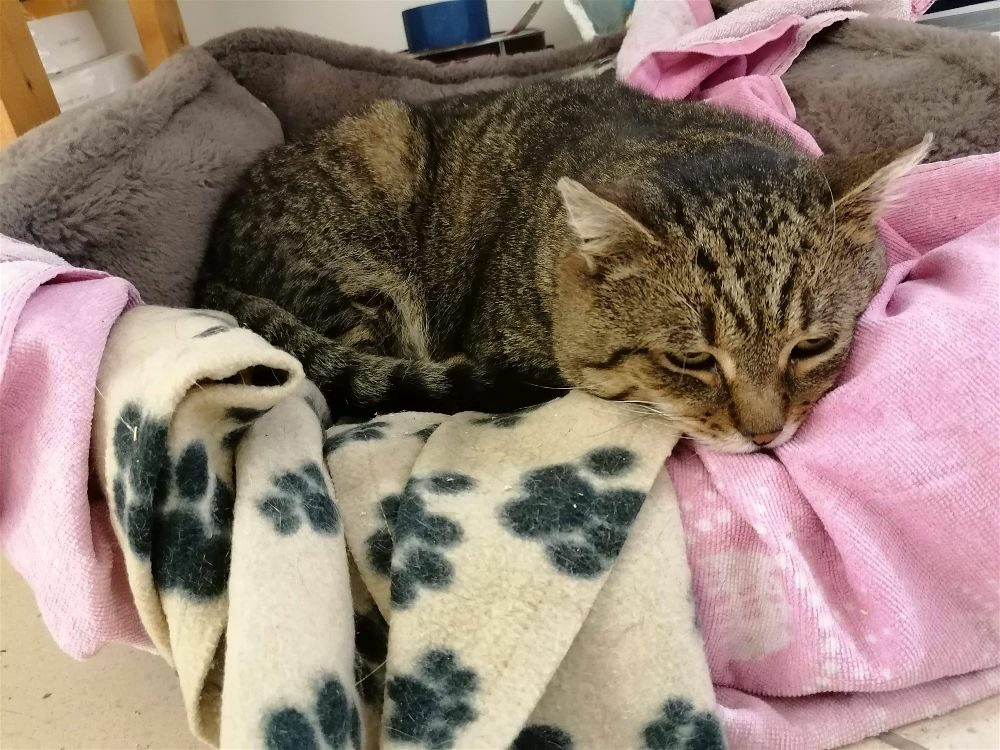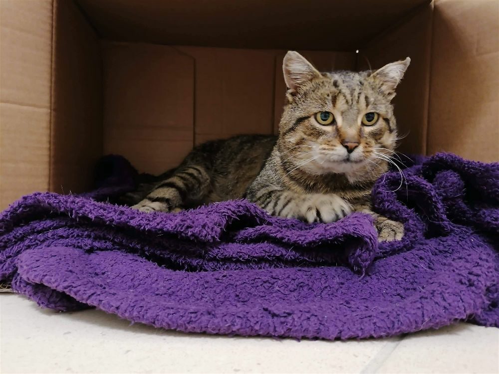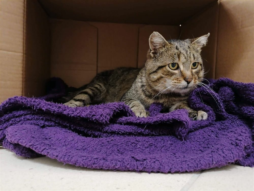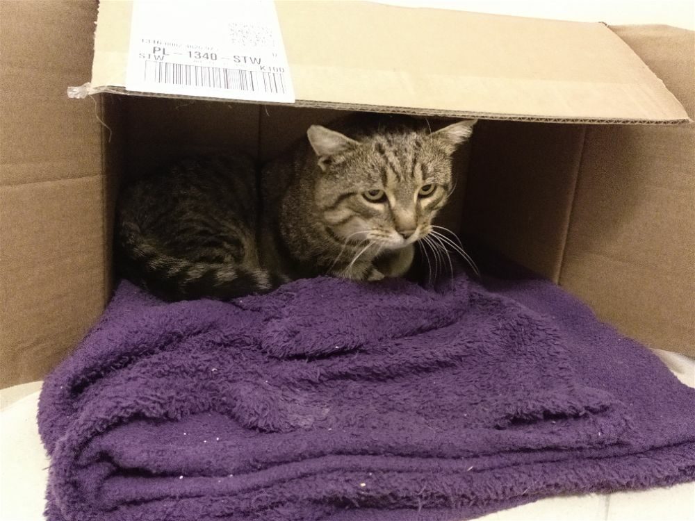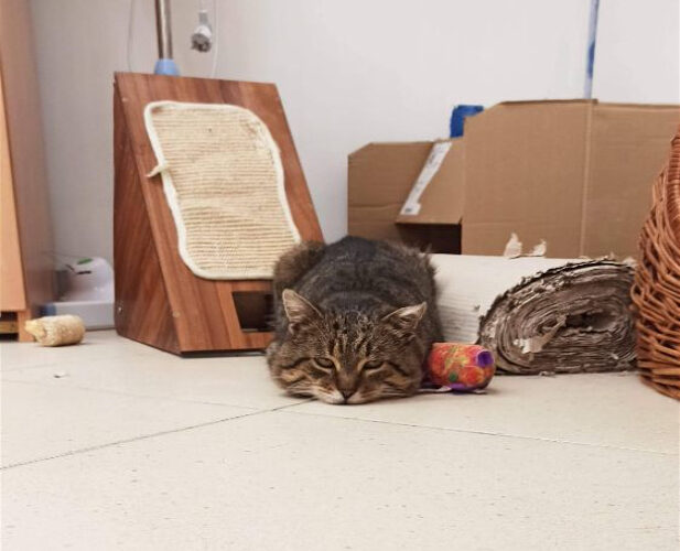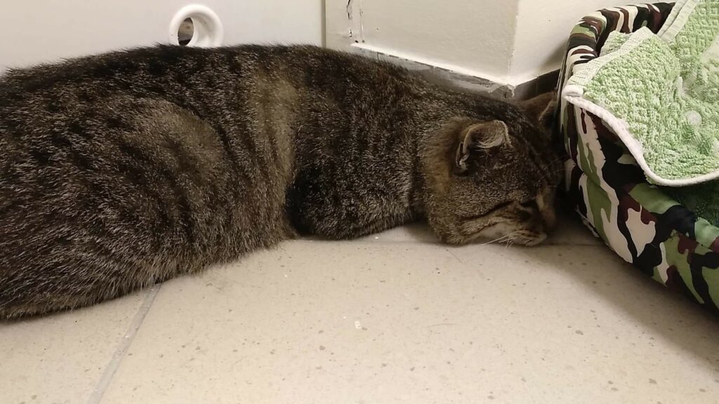O Fredku dostalyśmy cynk od sąsiadki, na miejscu już na nas czekał, spał przytulony do ściany bloku. Obudziłyśmy go. Miejscowa mówiła, że on tam jest już latami, ale ludzie go raczej nie lubią, kopią go, a on to wogóle ma chyba padaczkę. Jak ma atak to spada ze schodów, wpada w miski itp… Jedna pani o niego trochę dbała, zrobiła mu legowisko, dawała jeść i jakaś budkę wywalczyła od schroniska, ale Fredka inne koty przeganiały. Ludzie mu zostawiali lekko otwarte drzwi do klatki, żeby się ogrzał – to ktoś WYKRĘCIŁ stopke z drzwi. Kiedyś dzieci go nosiły, a on dostał atak, spadł i się bardzo poobilał. Wtedy dostal antybiotyk..