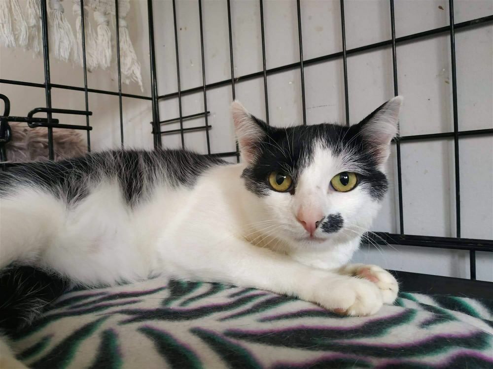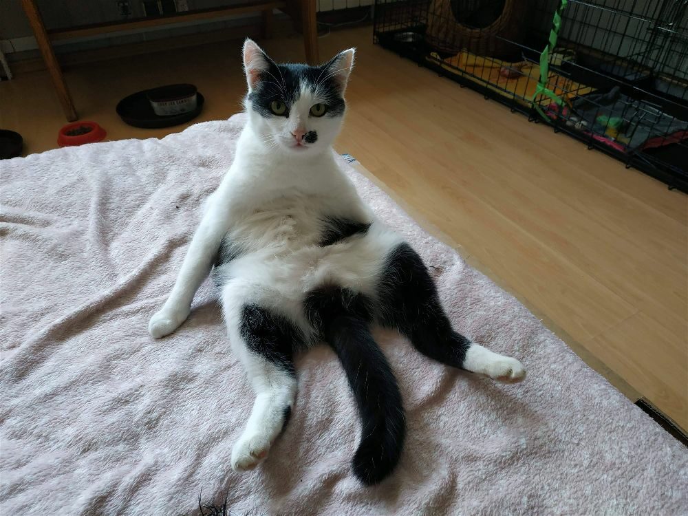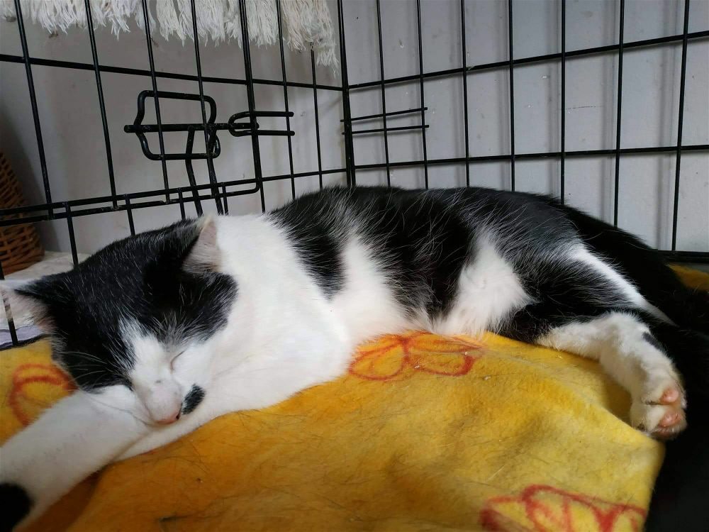 Ma charakterystyczną, śliczną czarną plamkę na pysiu. Śpi z mocno wyciągniętymi łapkami 🙂