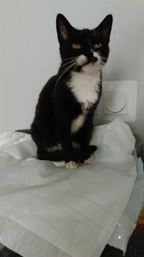 Znalazła go nasza wolontariuszka Ewelina, która mimo zmroku zauważyła z samochodu niewielki ruch. Do dziś się zastanawiamy, jak w ciemnościach dostrzegła kotka, który leżąc w kałuży błota był praktycznie niewidoczny. Kocurek, oprócz tego że był mokry, oblepiony błotem i zakrwawiony, był silnie wychłodzony i miał drgawki.