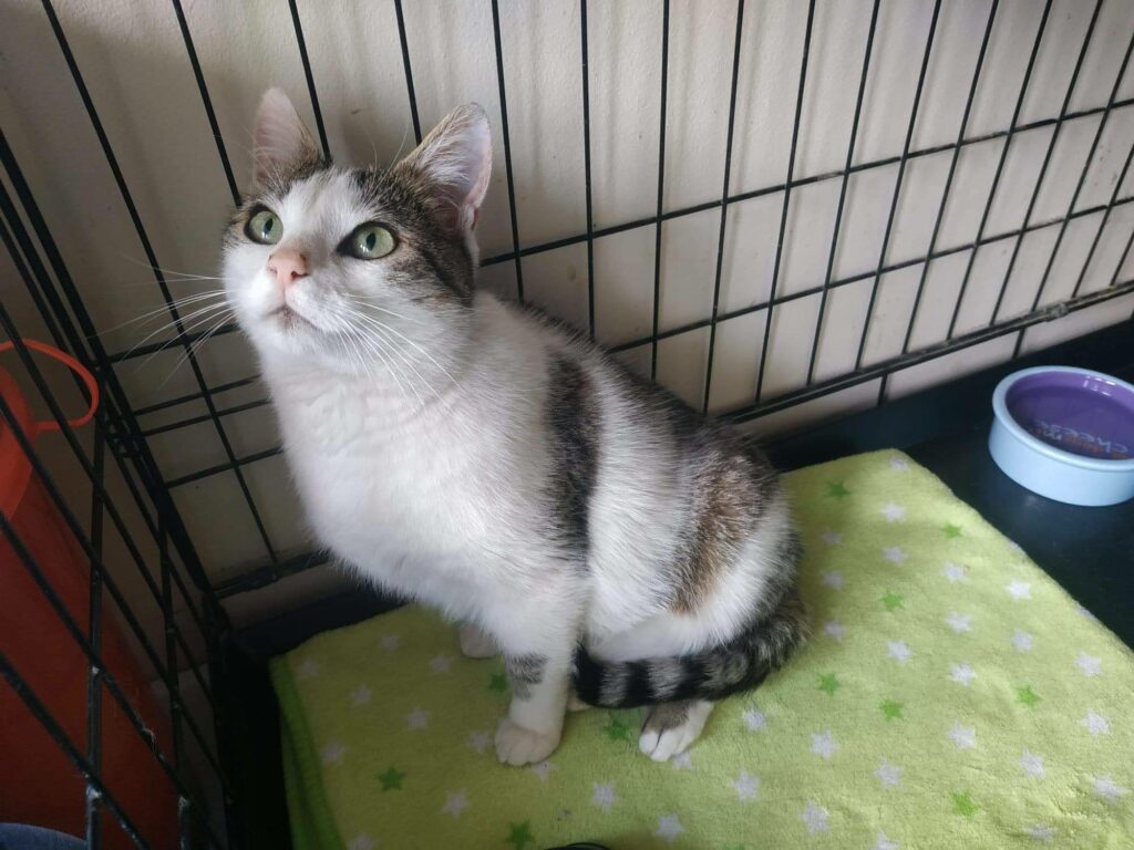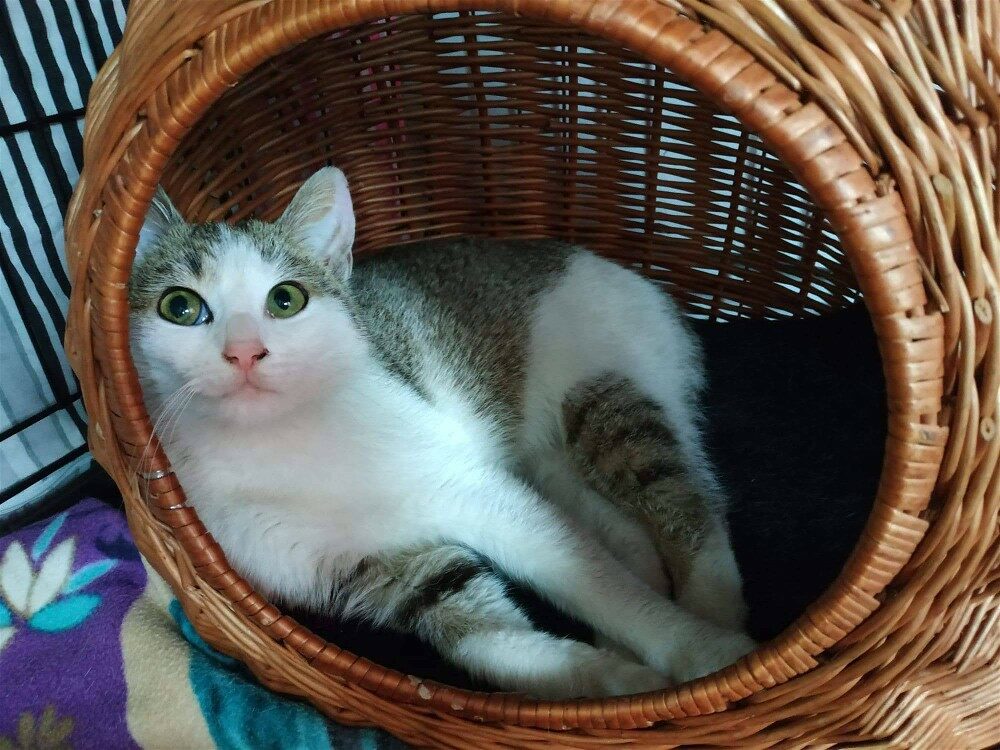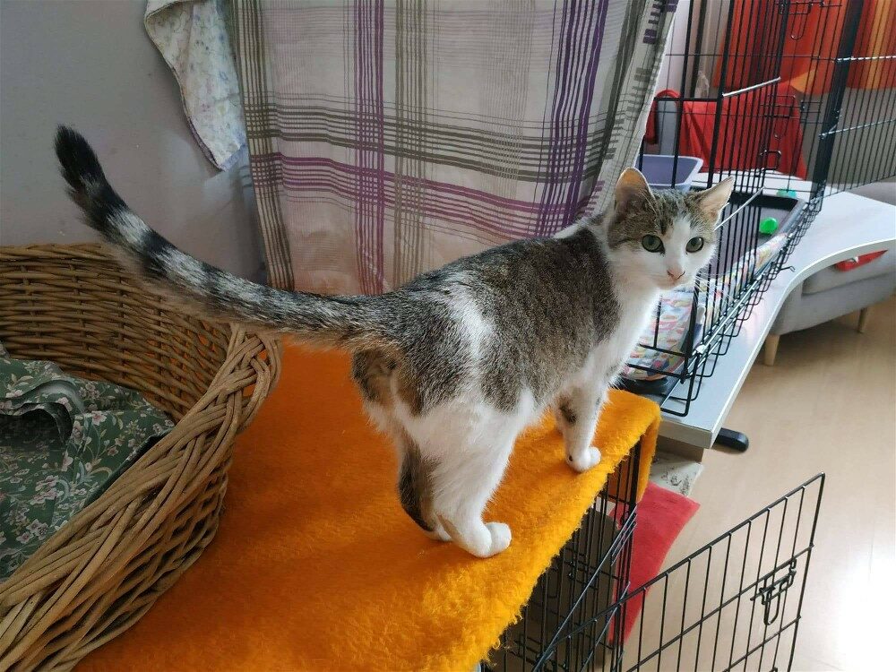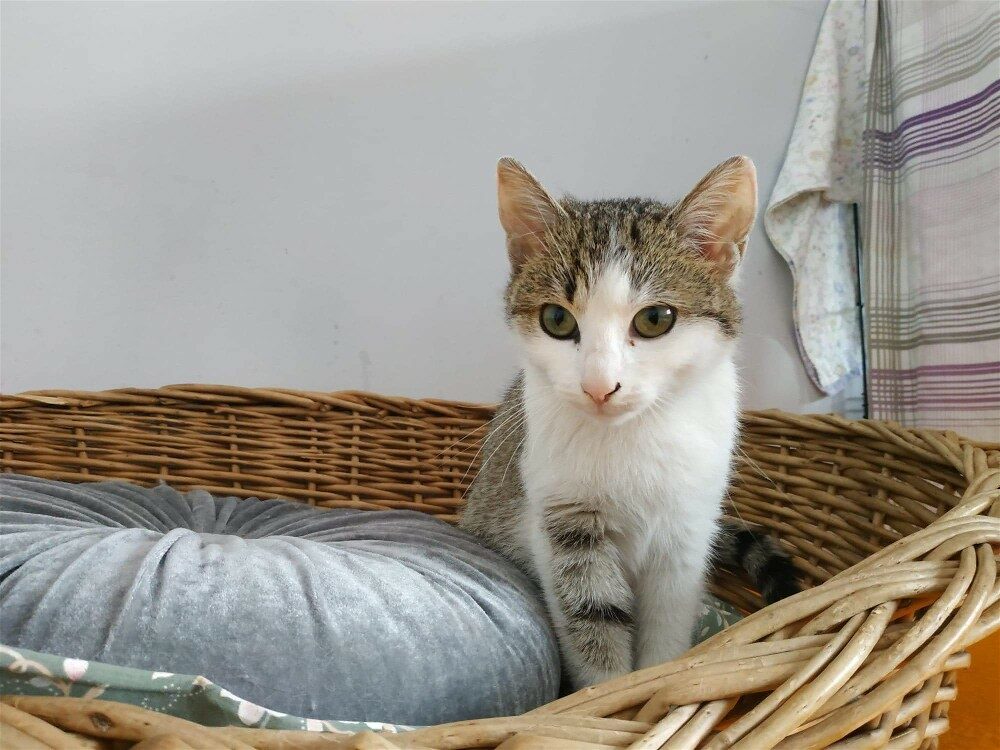 Pigwa trafiła do nas jako ciężarna młoda kotka, błąkająca się na terenie miasta i próbująca wysępić jedzonko na ładne oczy. Jest spokojna i łagodna. Cichym miauczeniem wita się z opiekunem i domaga głaskania 🙂 Lubi też zabawę.