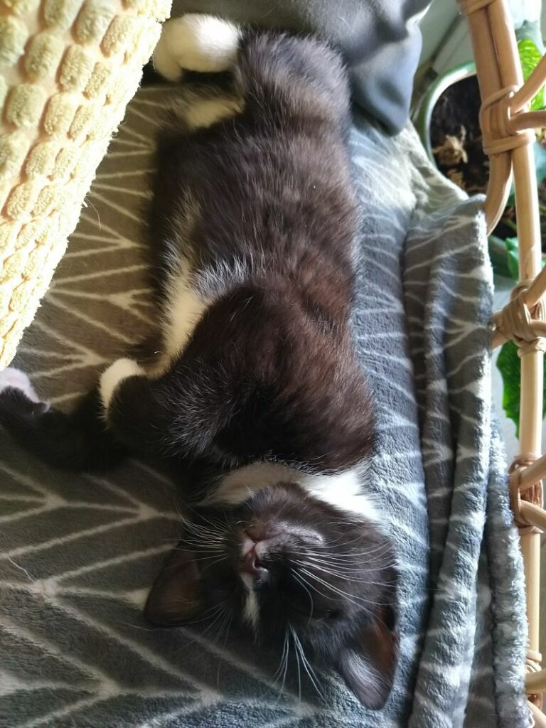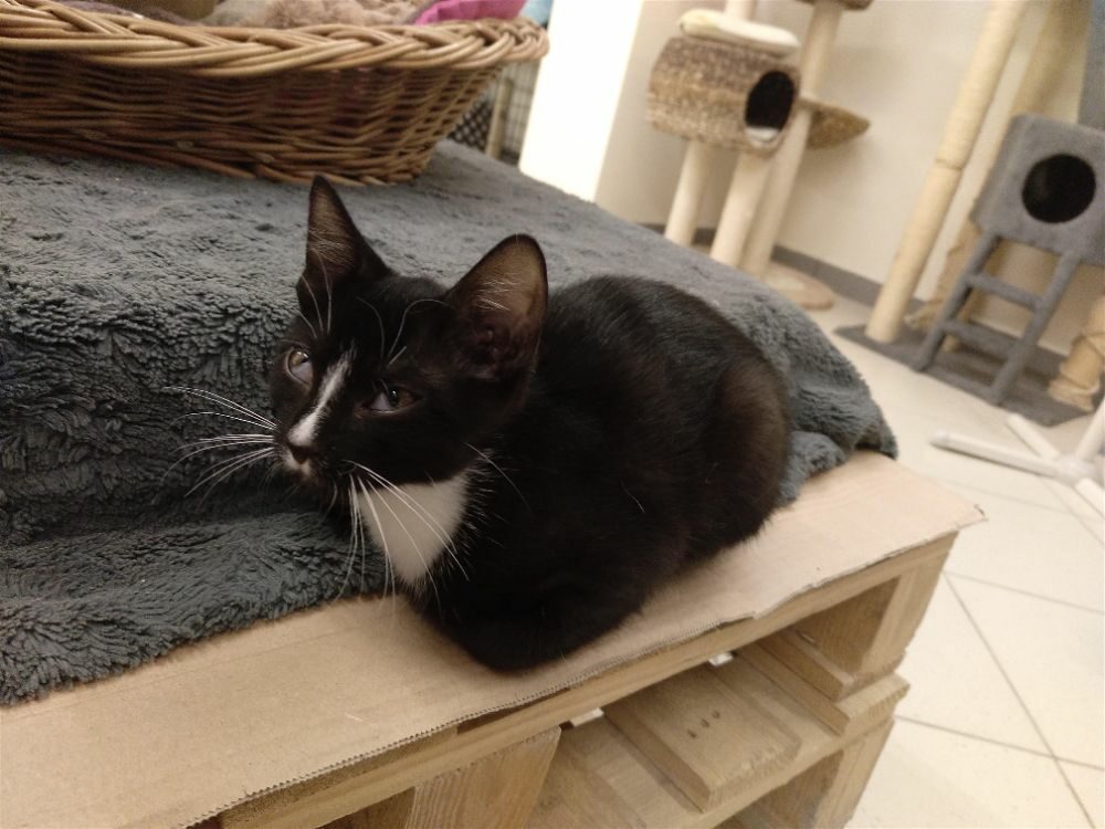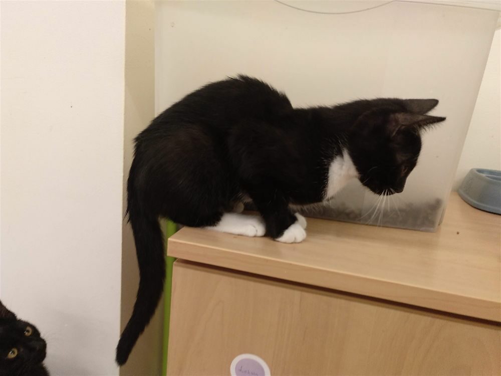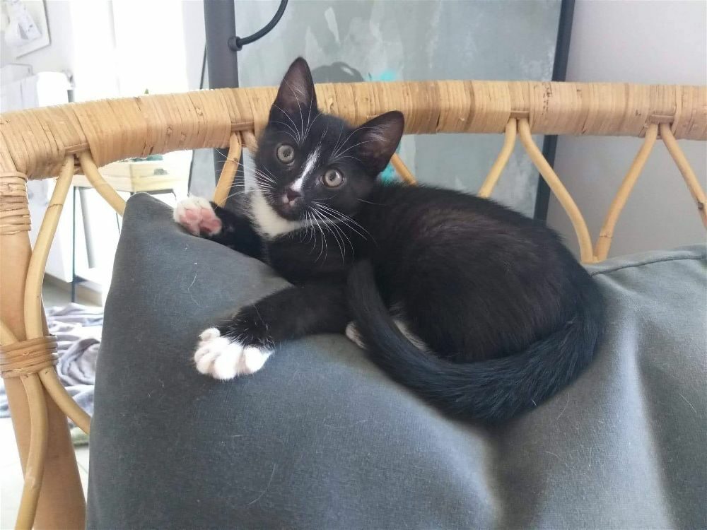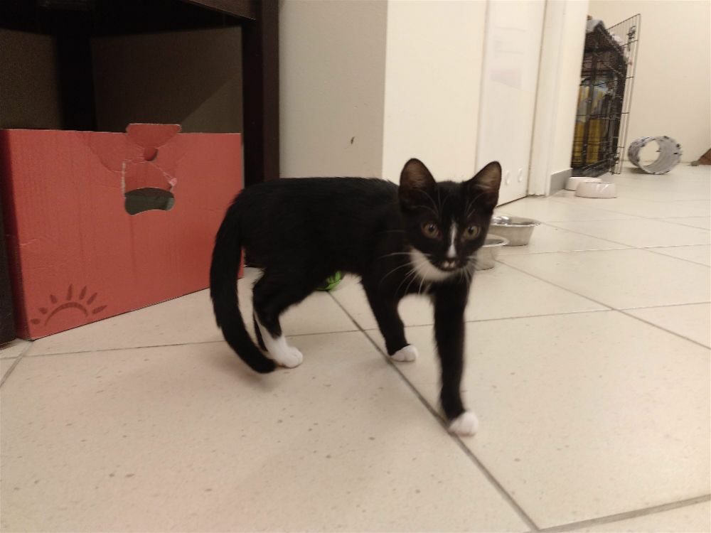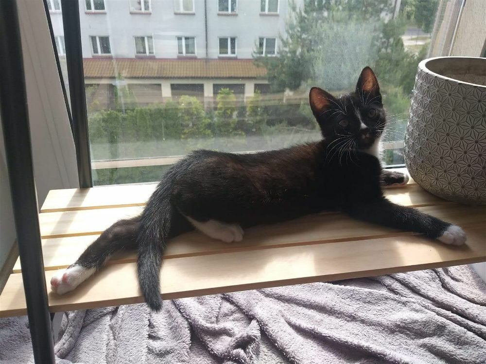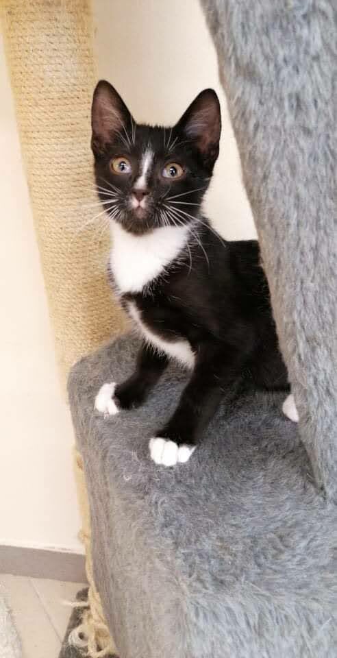 Taki maluszek trafił pod naszą opiekę w klatce dla ptaków. Jest rozbrykanym urwisem, który kocha zabawy, ciągle biega i szaleje z zabawkami. Lubi też czasem poleżeć i pomruczeć. Uwielbia towarzystwo kotów, zwłaszcza Bezy. Wymaga kociego towarzystwa.