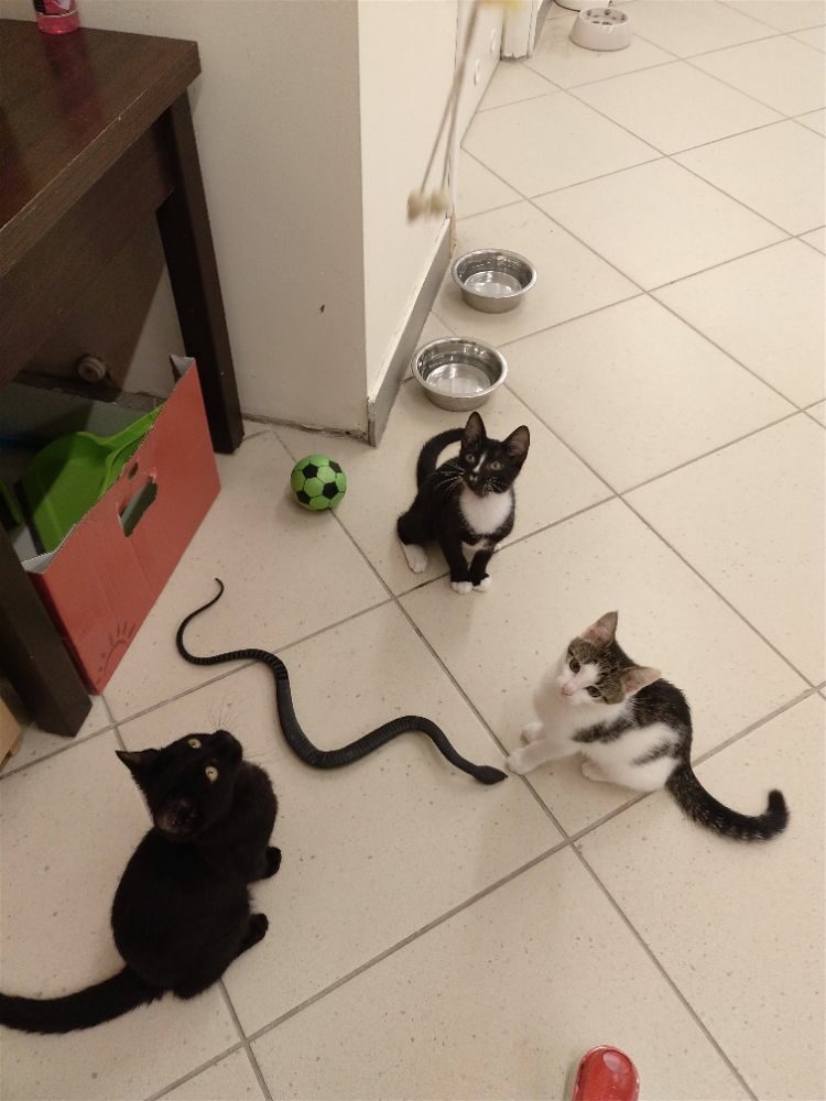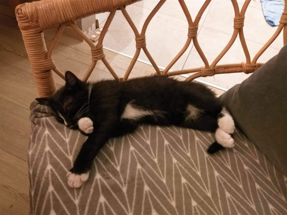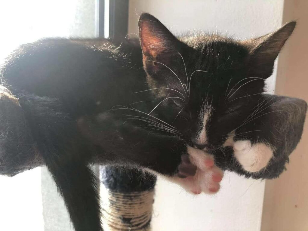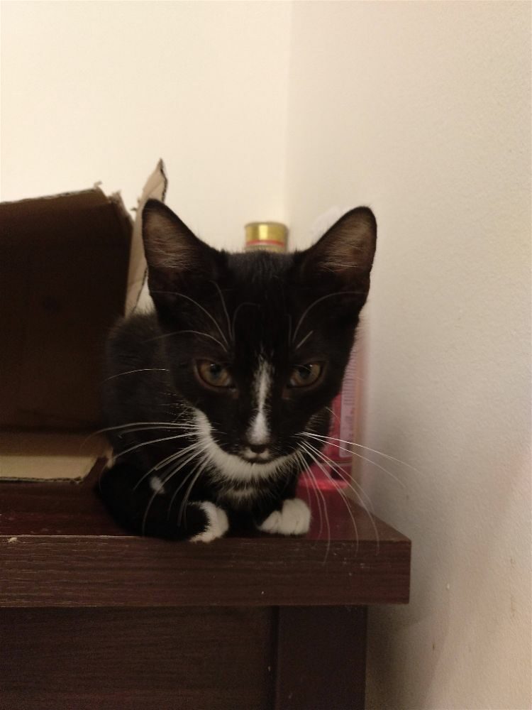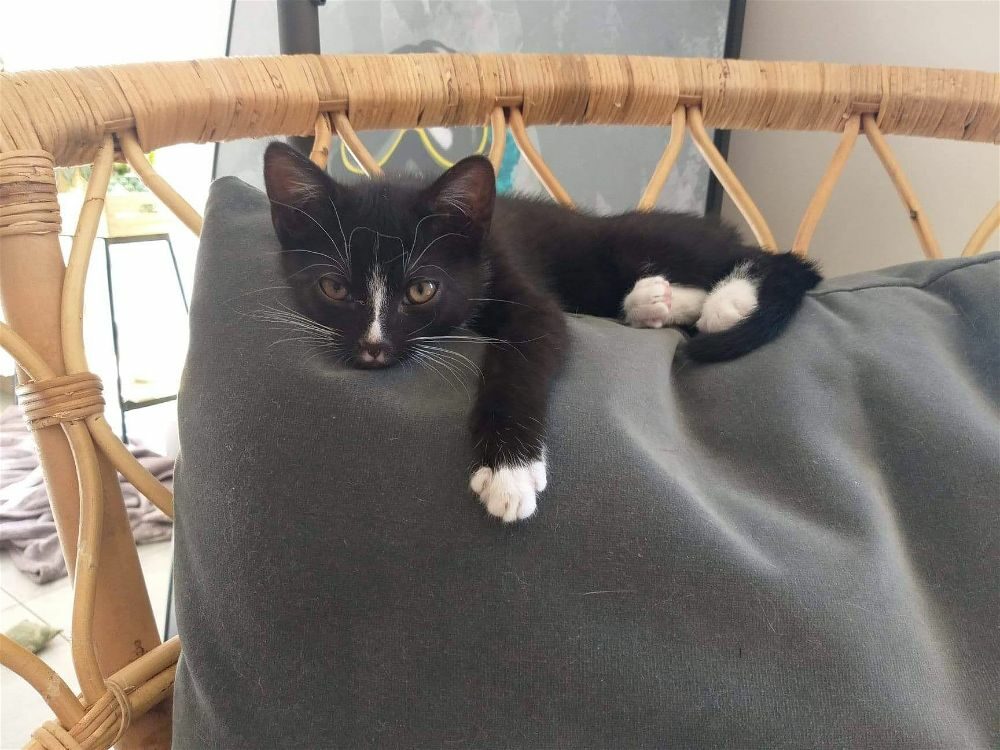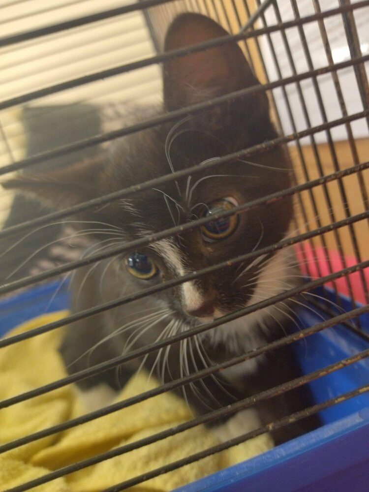 Taki maluszek trafił pod naszą opiekę w klatce dla ptaków. Jest rozbrykanym urwisem, który kocha zabawy, ciągle biega i szaleje z zabawkami. Lubi też czasem poleżeć i pomruczeć. Uwielbia towarzystwo kotów, zwłaszcza Bezy. Wymaga kociego towarzystwa.