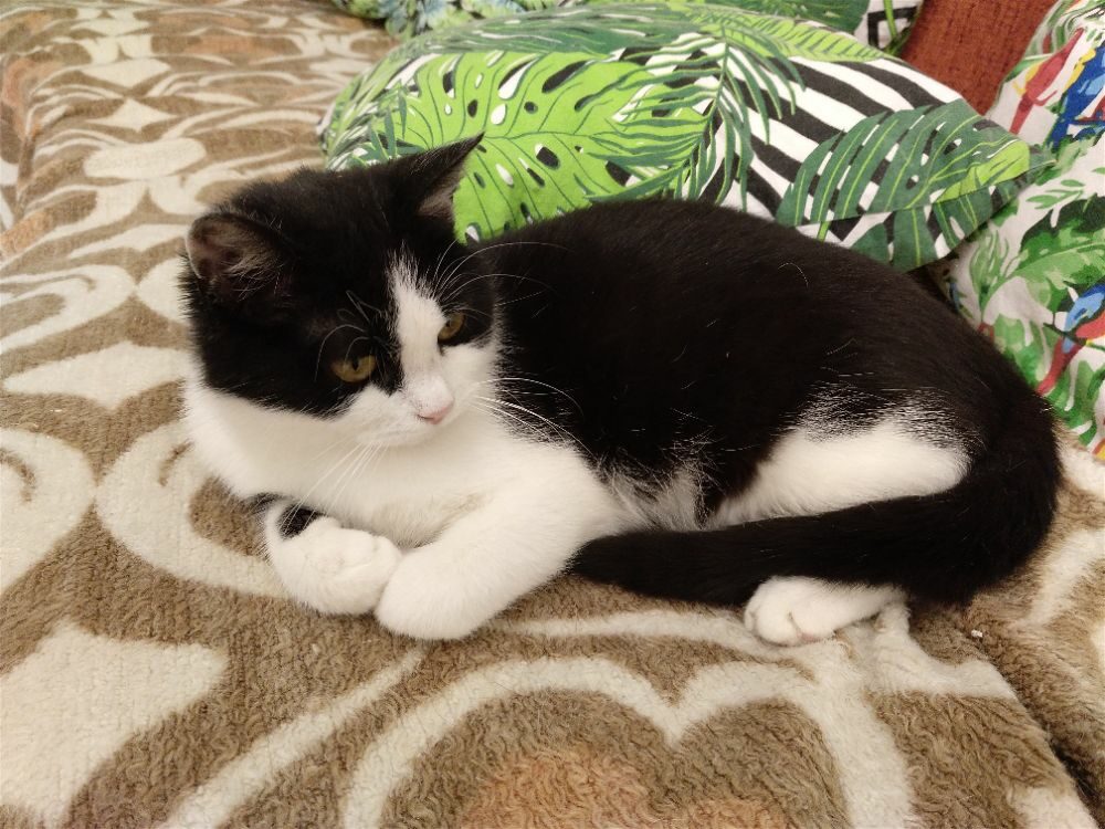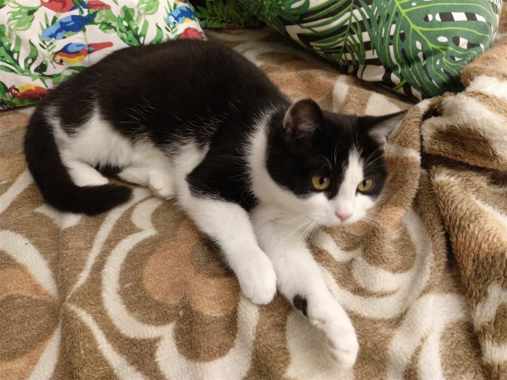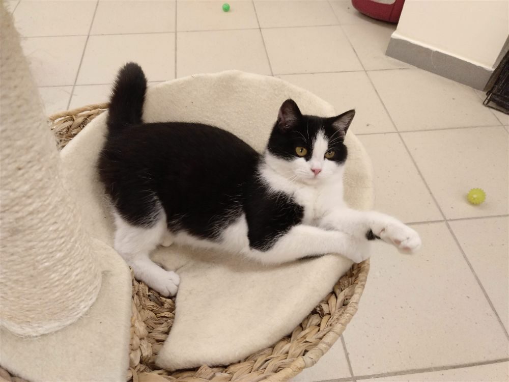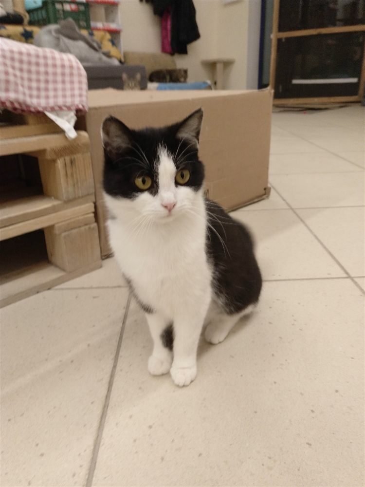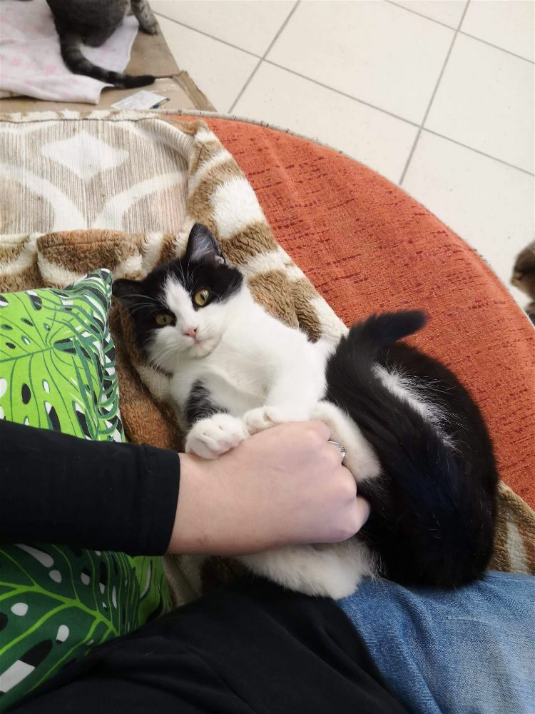 Kotka została znaleziona na czyjejś posesji wraz z trójką rodzeństwa, prawdopodobnie przyszły od kotki sąsiadów pozostawione samopas. Uwielbia głaskanie. mruczy, ugniata, przychodzi do człowieka po więcej, czasem jest bojaźliwa. Uwielbia ganiać za piłeczkami. Do oddania z kocim towarzystwem.
