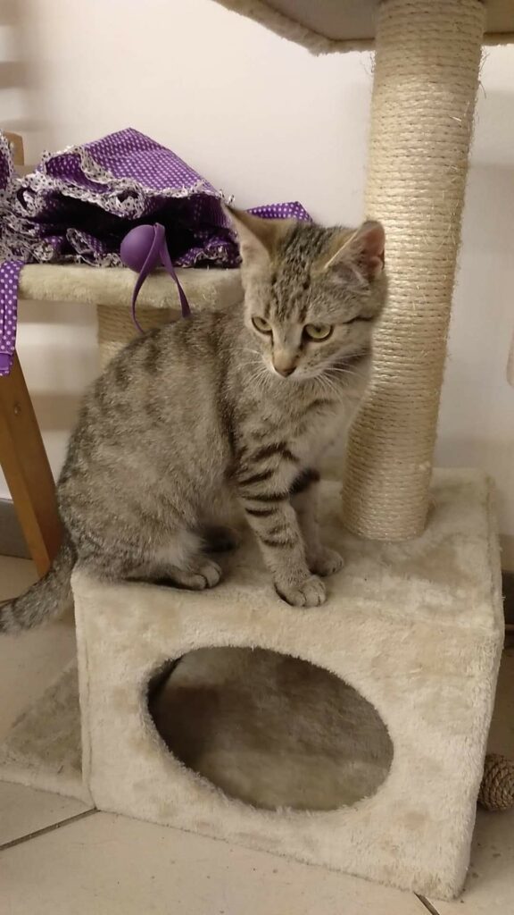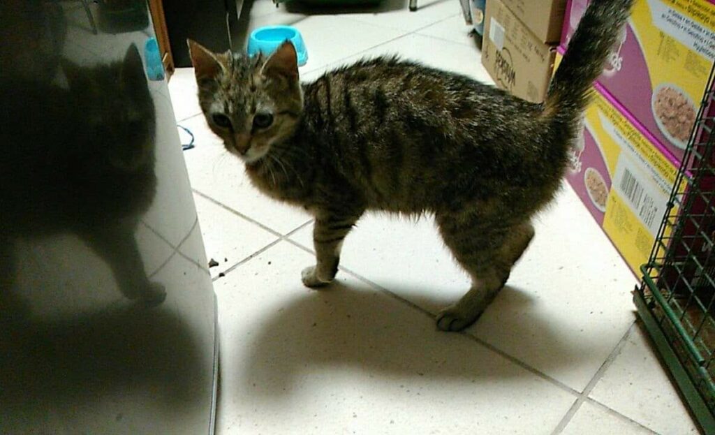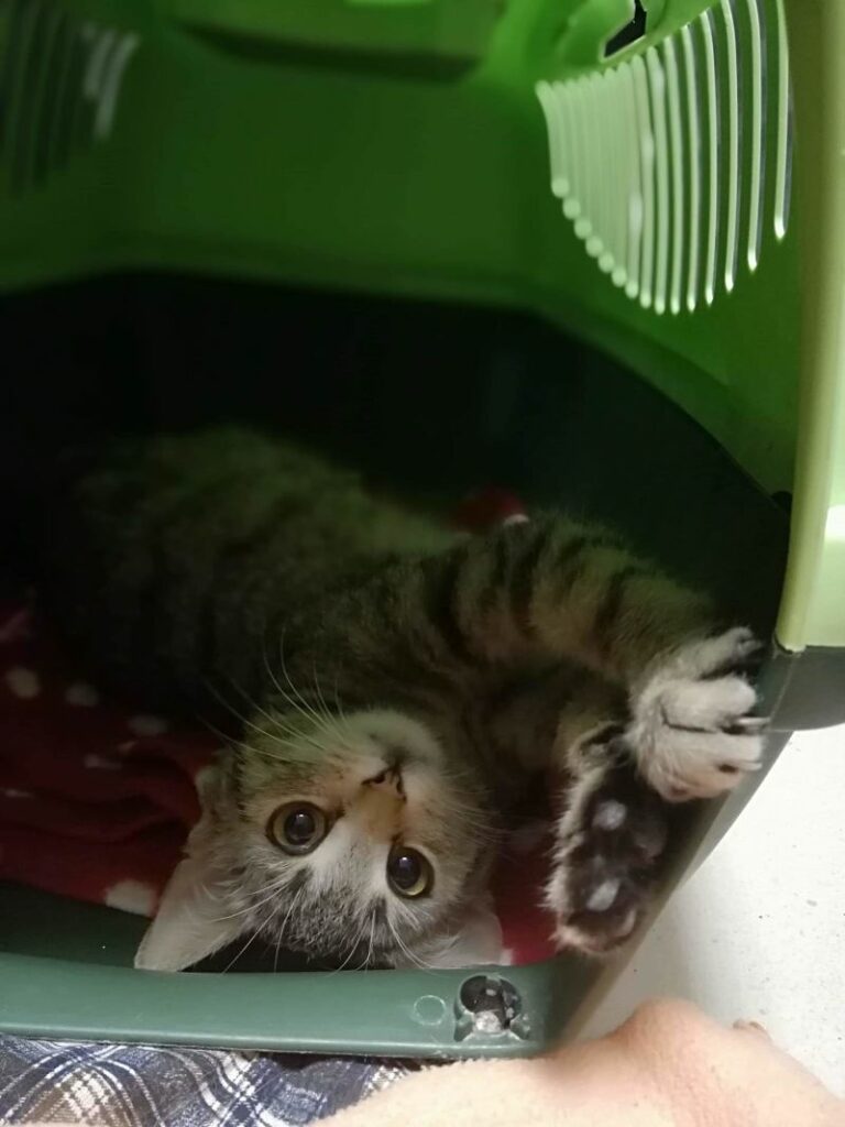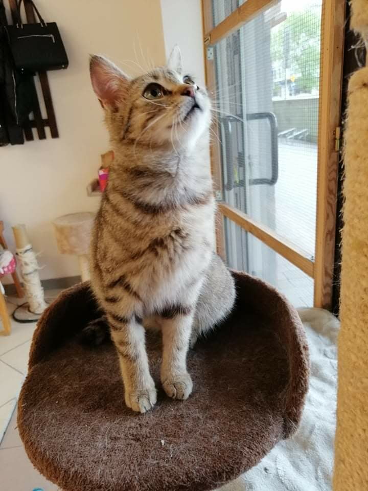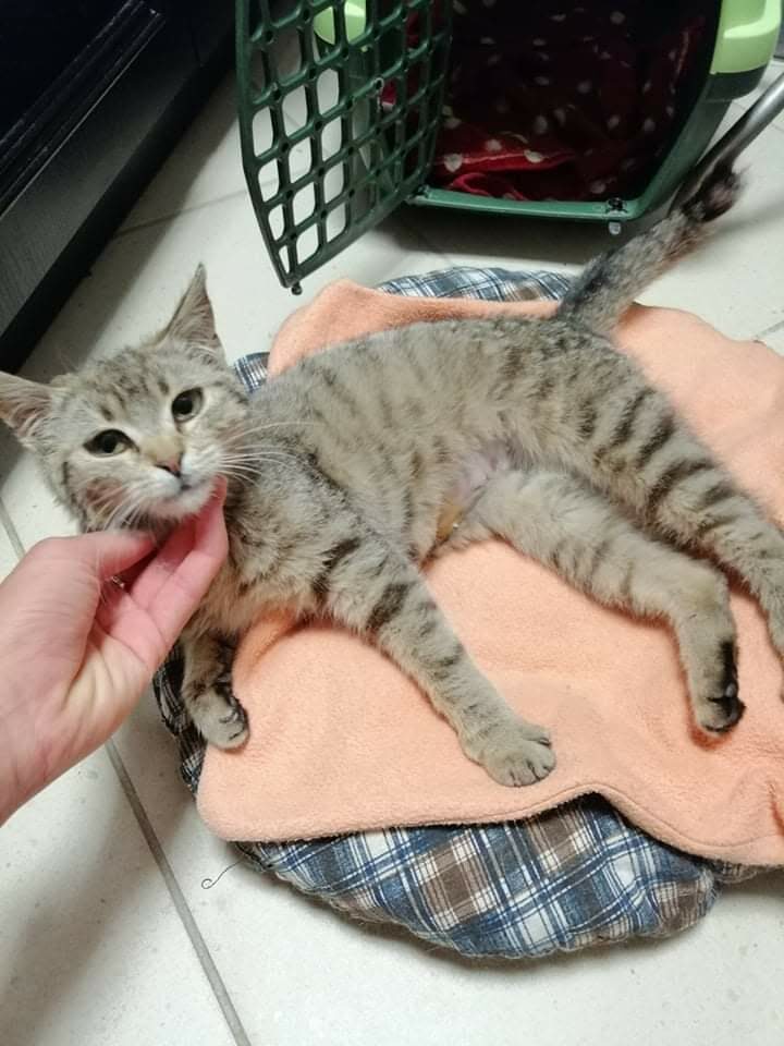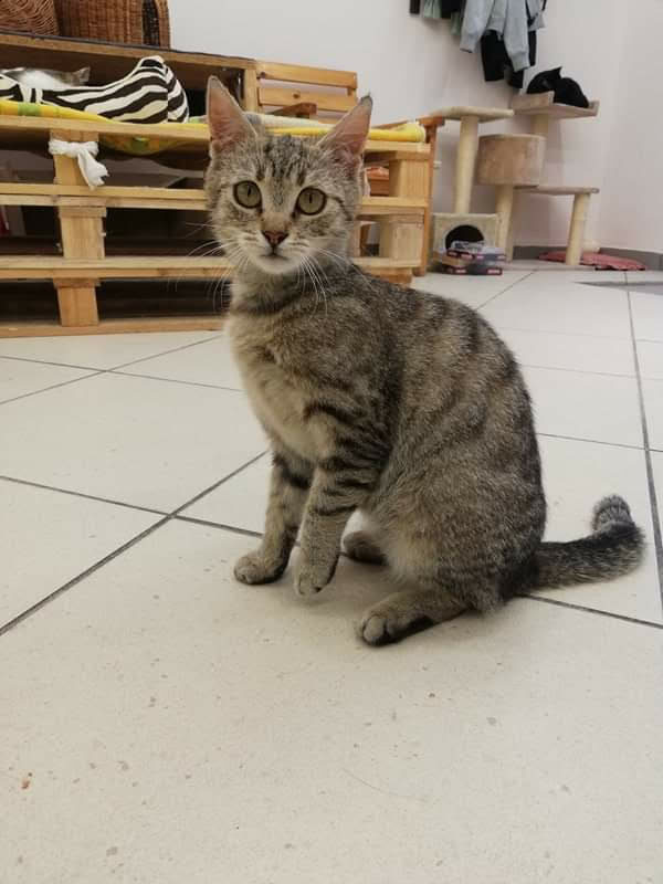 Ta maleńka kruszynka, o posturze 4-miesięcznego kociaka, została znaleziona na ulicy, będąc w zaawansowanej ciąży. Jest tak drobna, że poród pięciu kociąt, wiązałby się dla niej z ogromnym ryzykiem. Dzięki szybkiej interwencji Pani weterynarz, która po godzinach przeprowadziła zabieg sterylizacji, koteczka nigdy nie stanie w obliczu tych zagrożeń.. Malutka jest wyjątkowo przyjazna i ufna w stosunku do ludzi. Docenia pełną miseczkę i bezpieczne schronienie w koszyczku, a na każe zawołanie, wychodzi się przywitać. Mimo tego, że wygląda na kocie dziecko, musiała już w życiu dużo przejść. Jest niedożywiona i ma urwaną końcówkę ogonka, co świadczy o tym, że uległa albo wypadkowi, albo padła ofiarą złych ludzi. Mamy wielką nadzieję, że szybko znajdzie się dobra dusza, chętna przygarnąć tą małą burą istotkę – choćby tymczasowo…