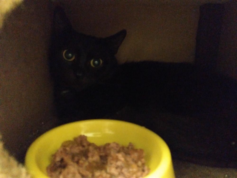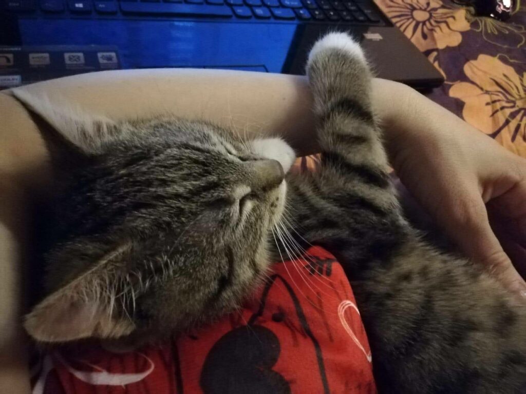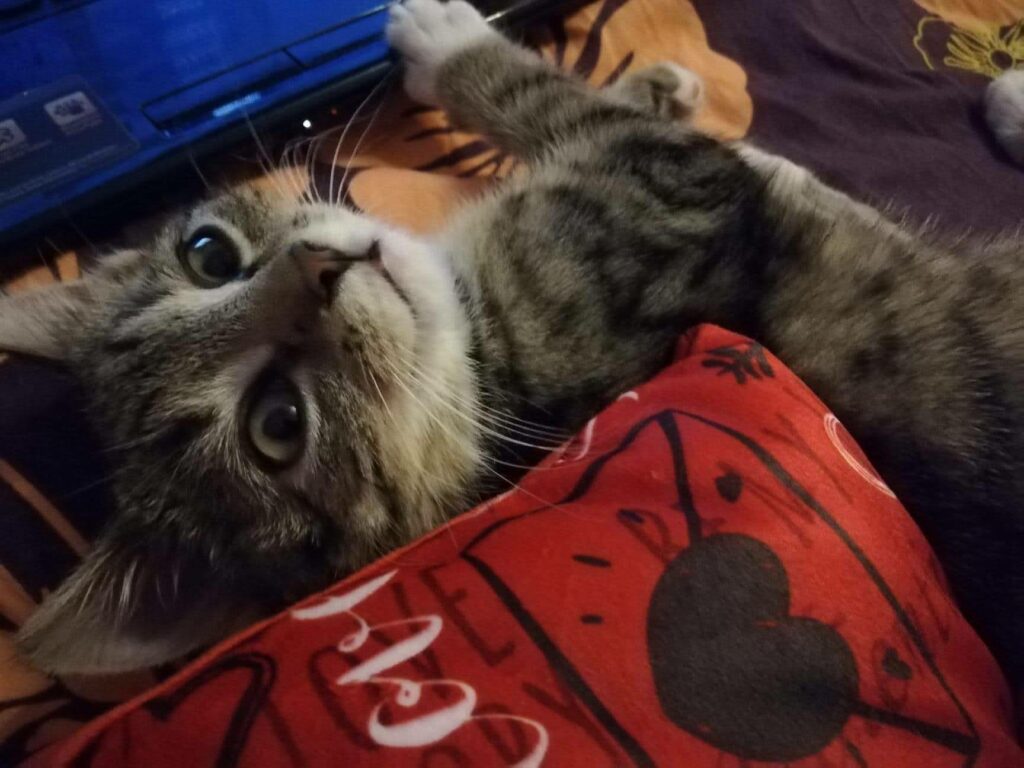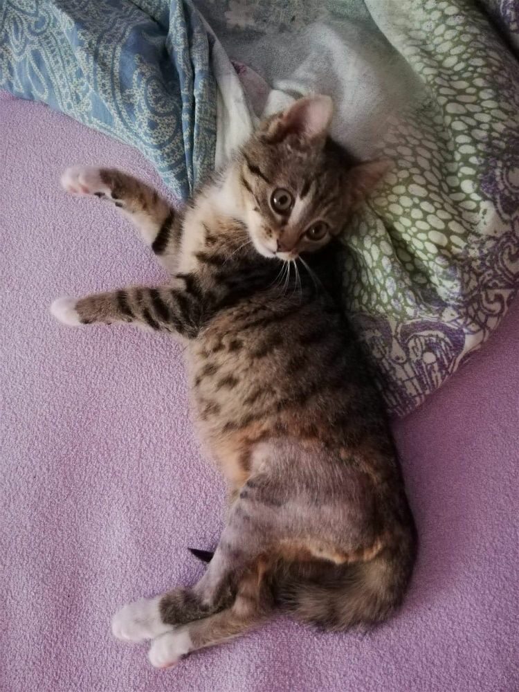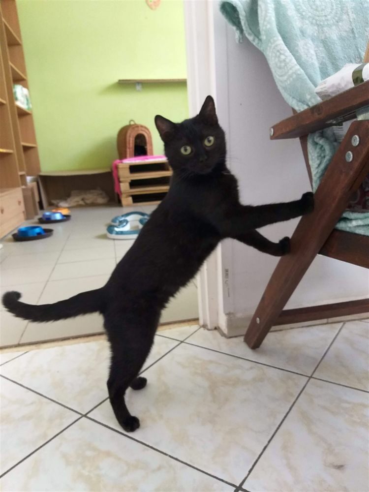 Przez pierwsze tygodnie, każdy najmniejszy gest w jego stronę, wywoływał panikę i ucieczkę za wszelką cenę. Kolejne dni, obserwował otoczenie z ukrycia. Teraz zaczyna doceniać głaskanie, nieśmiale zwiedza otoczenie i potrafi w towarzystwie człowieka zjeść posiłek. Nauczył się też mruczeć i wystawiać brzuszek do nieba, pokazując tym samym zaufanie jakim nas darzy.