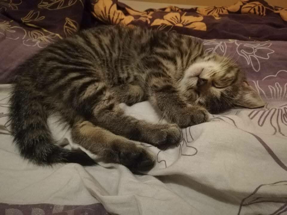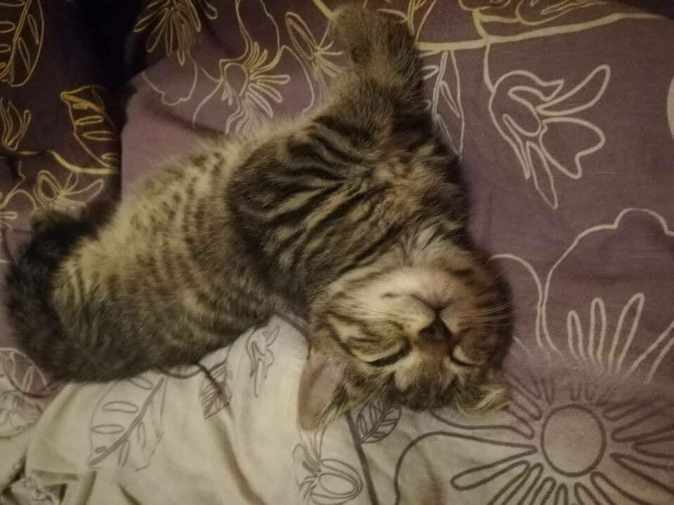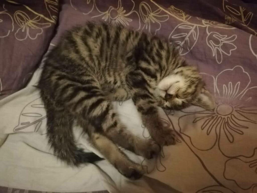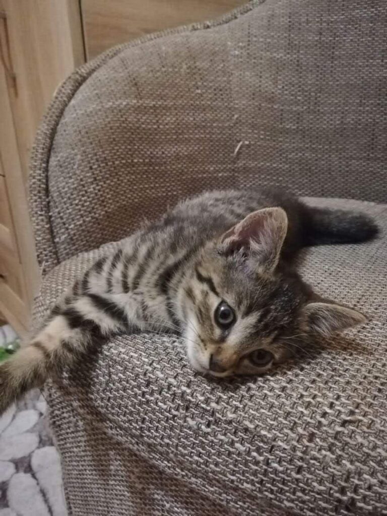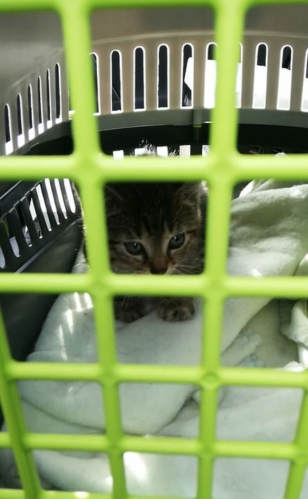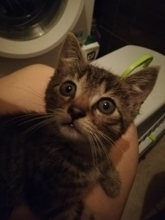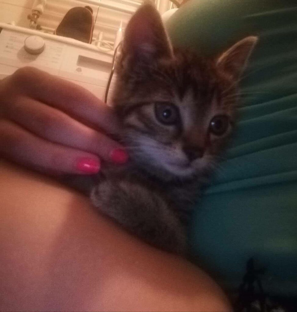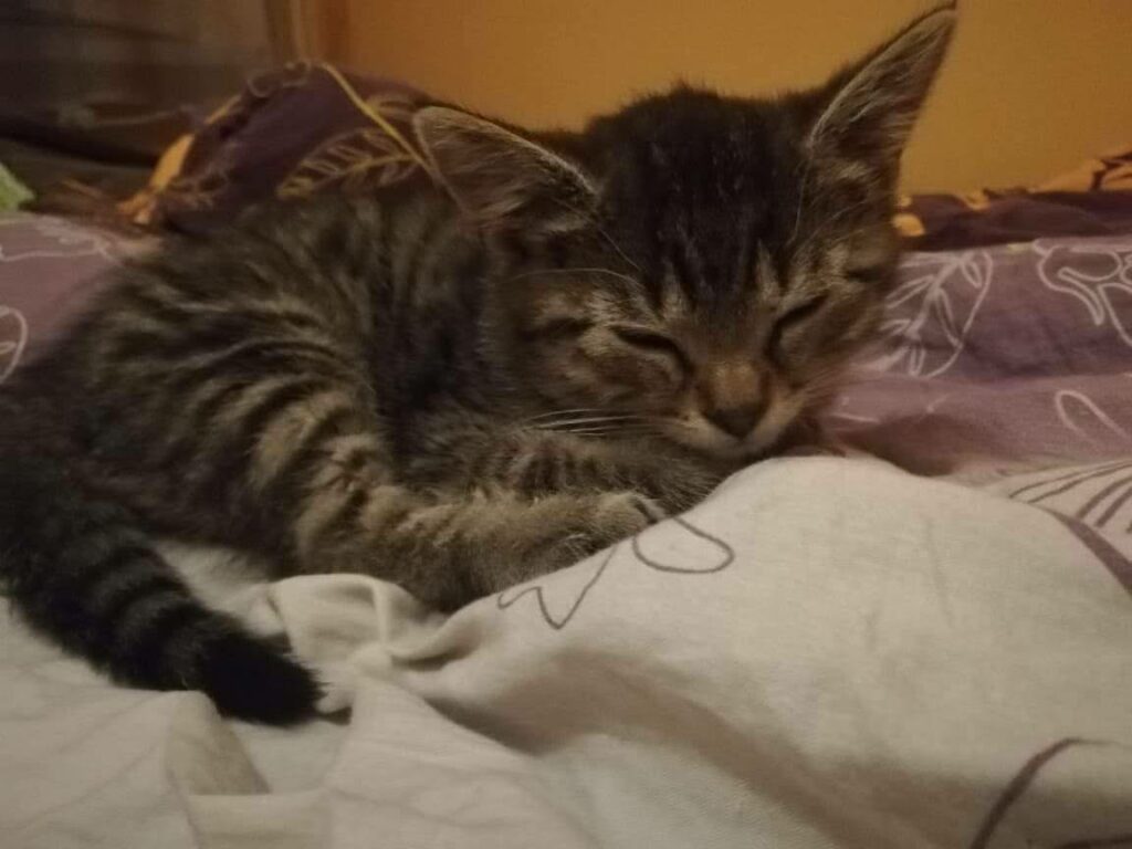 To bure maleństwo głośno płakało za mamą, na terenie jednego z dużych sklepów budowlanych. Złapany w końcu przez pracowników, był tak przestraszony, że mocno trzymał się łapkami człowieka, jakby nie chciał, żeby go zostawić