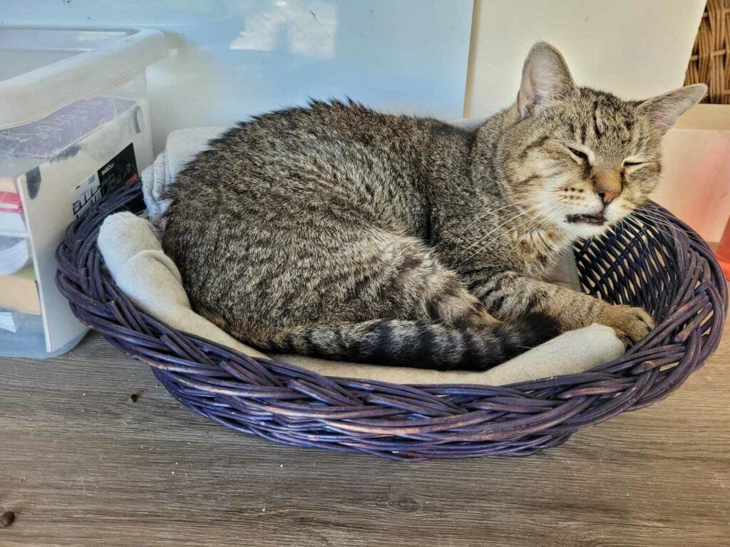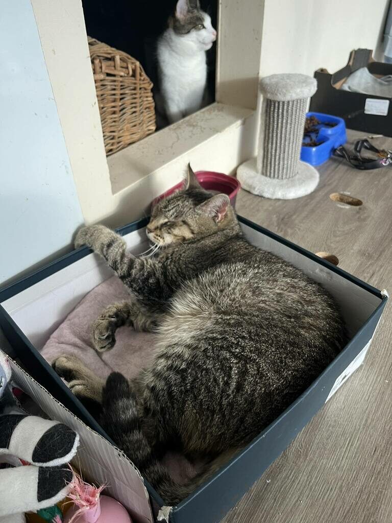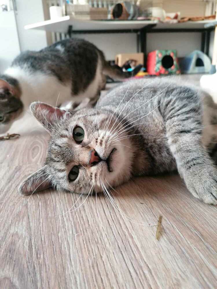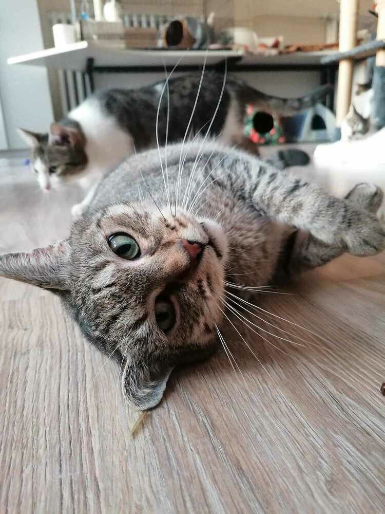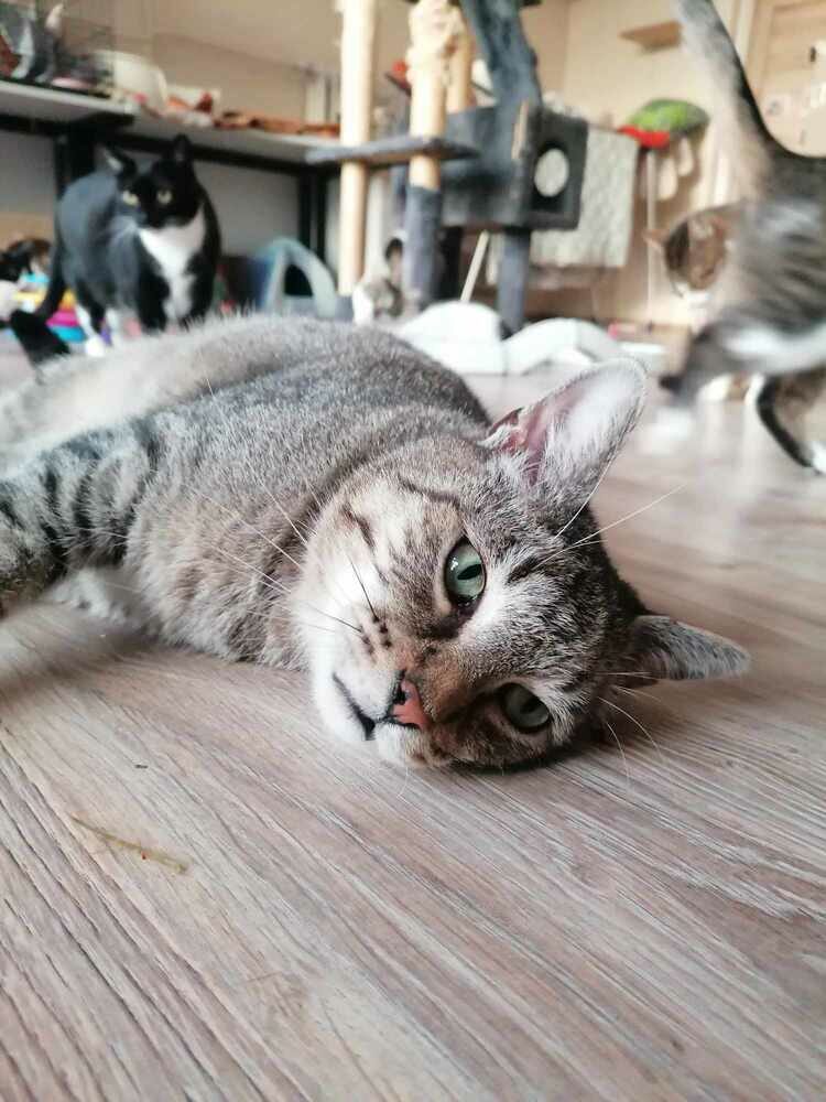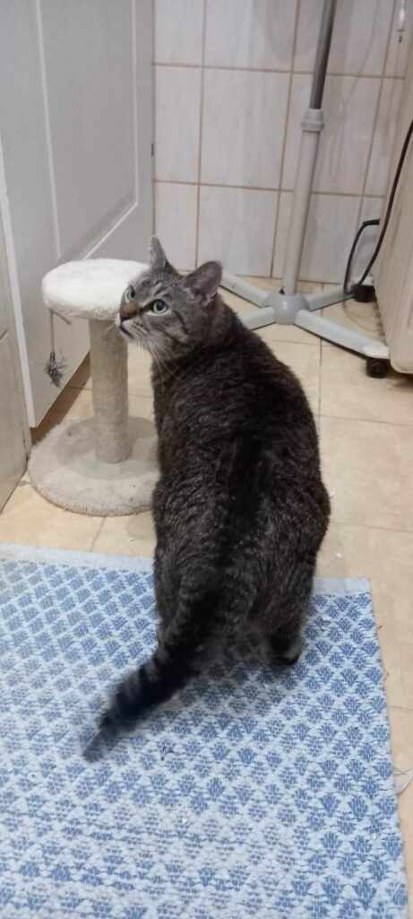 Po niespełna roku, jest już radosnym, zadowolonym kocim kawalerem. Problemy socjalizacyjne oczywiście wystąpiły i nadal obserwujemy u niego przebodźcowanie i nerwowość, ale pamiętając o 3 latach jego niewoli, dajemy mu przestrzeń i wyrozumiałość.